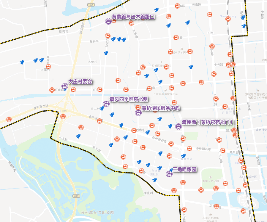 目前,黄桥街道现有公交站点共96个,另有10个公交站可直接接驳5个地铁站。在覆盖现有公交站点的基础上,创新增设虚拟点位66个,用于满足动态公交的车辆上下客功能,重点服务离现有公交站点距离较远的小区出入口、商业体、产业园等区域。