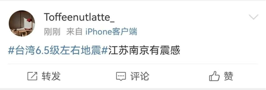 此前报道:台湾宜兰海域突发6.6级地震,福建多地震感强烈,江苏多地网友也反映有震感。