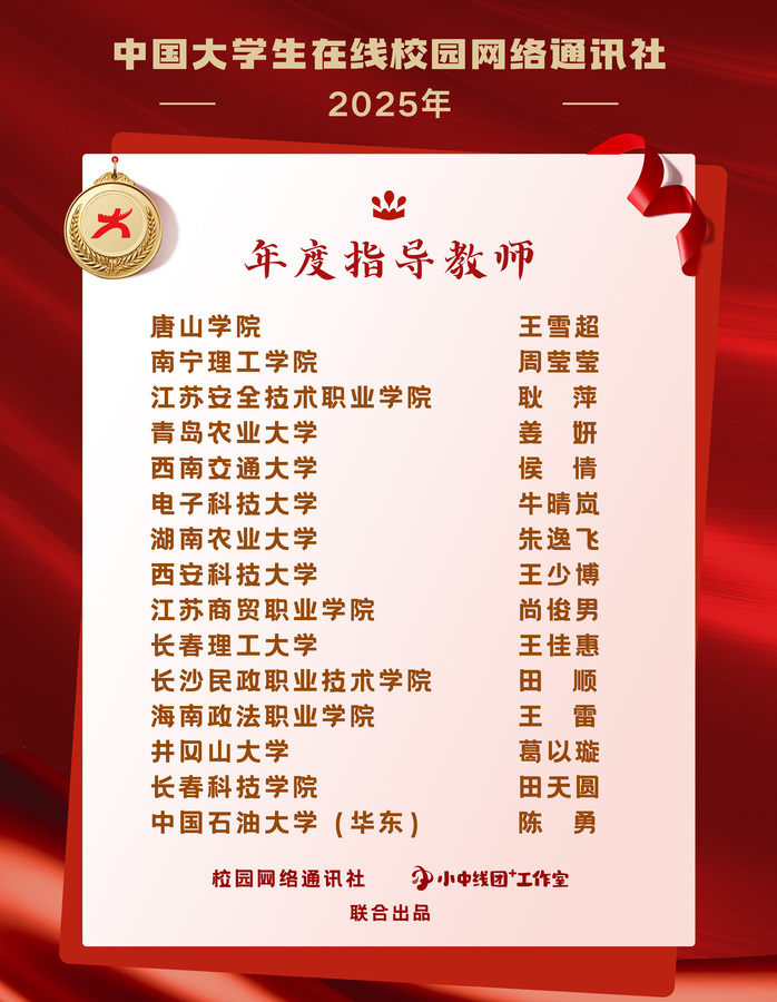 12月25日,教育部中国大学生在线公布了2025年校网通社获奖名单。江苏安全技术职业学院入选年度校网通站,获评年度网络文化活动优秀组织高校。党委宣传部耿萍老师入选中国大学生在线校园网络通讯社“年度指导教师”,校大学生记者团学生赵晨冉入选“年度学生通讯员”。