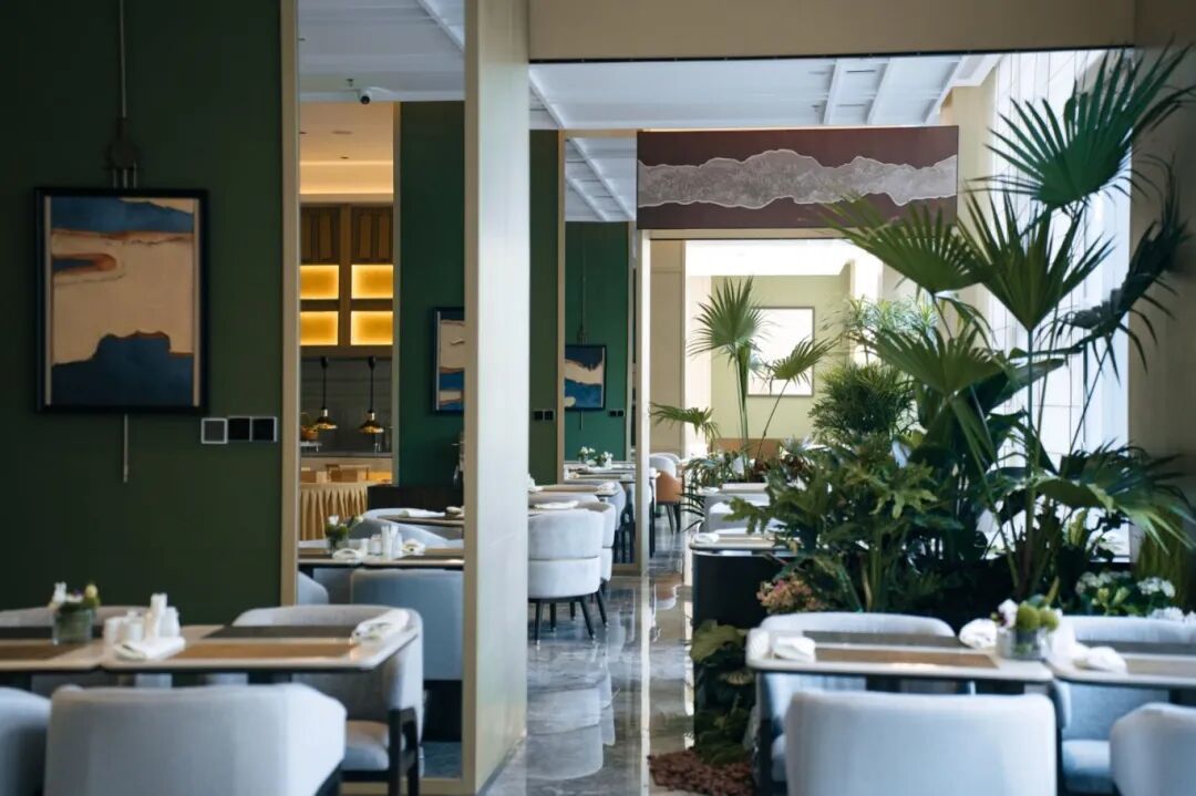 酒店坐落于盐城盐南高新区核心地段,总建筑面积约2.7万平方米。建筑以高空外廊与空中连廊勾勒出独特的天际线,成为崭新的城市艺术地标。室内设计延续格蓝柏薇“南洋美学融入本地风情”的理念,将经典现代笔触与盐城湿地文化的静谧悠然相融合,通过东方礼序、自然材质与当代艺术的交织,于繁华城芯营造出一处可安顿身心的度假港湾。