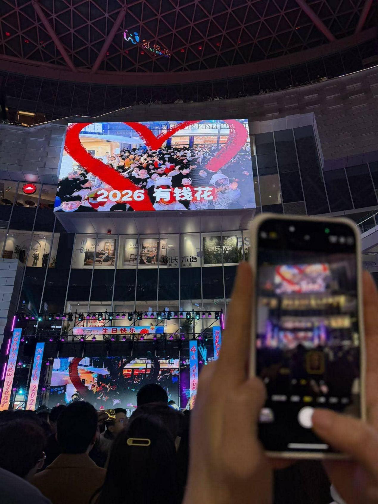 活动现场,主办方还贴心设置了照片直播二维码,让观众随时定格精彩瞬间、收藏美好回忆。跨年倒计时环节,全场观众手持荧光棒共同倒数,绚烂的礼花与冷焰火照亮夜空,彩色纸片上的新年祝福语随风飘落,营造出梦幻而浪漫的氛围。“转身拥抱身边人” 的浪漫互动,更让陌生人之间的善意在此刻传递,让跨年夜充满了双向奔赴的温暖。