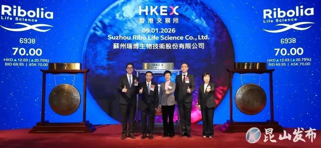 2025年最后两天,苏州两家企业接连上市。2026年,江苏新年“第一股”又花落苏州。今天(1月9日),苏州瑞博生物技术股份有限公司成功在香港联合交易所主板挂牌上市,成为今年全省首家上市企业。