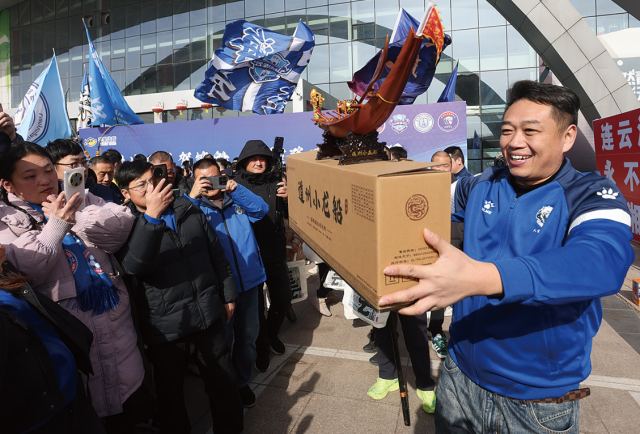 礼遇双向,情谊绵长。连云港球迷为远道而来的客人们送上江苏省第21届省运会吉祥物猴宝、苏超连云港队队旗,各家球迷会还贴心准备了围巾,智游连云港则带来孙悟空玩偶与耳套,让冬日的相聚倍添温情。得知连云港即将在今年举办江苏省第21届运动会后,陈洪江也专门送上了祝福。