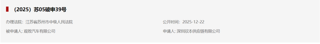 天眼查披露的天眼风险信息显示,2025年12月22日,观致汽车有限公司新增一则破产审查案件,申请人为深圳欣本供应链有限公司,经办法院为江苏省苏州市中级人民法院。因被长期拖欠款项,深圳欣本选择将曾经的合作伙伴告上法庭,申请破产审查,正式进入法定破产重整程序。