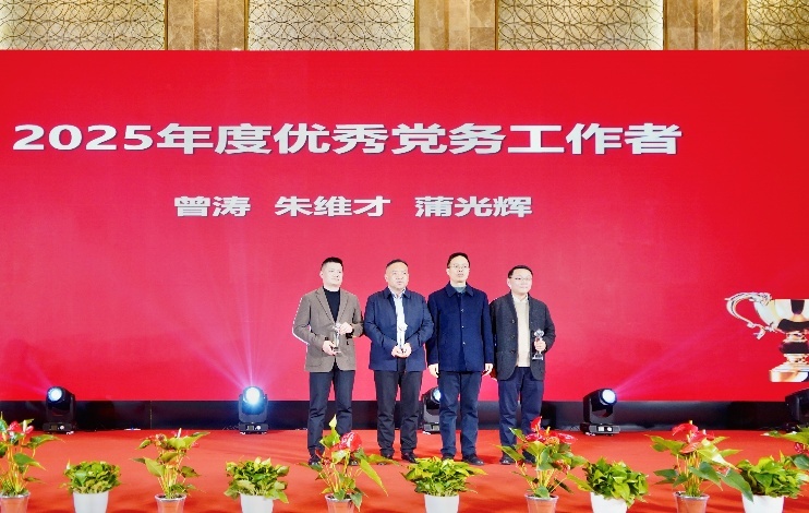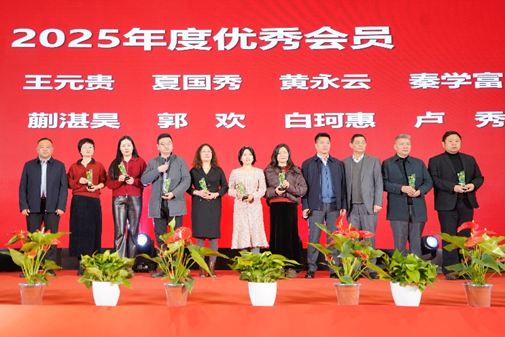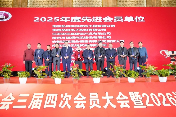 商会党支部书记曾涛宣读 2025 年度表彰决定。南京市工商联总商会党委副书记李友伟为“2025年度优秀党务工作者”颁奖;商会监事长余广生、常务副会长朱维才为“2025 年度优秀会员”颁奖;商会名誉会长余述南先生、吕德宝为“2025 年度先进会员单位”奖;六安市政协副主席、市工商联主席于军为“2025 年度在宁皋商慈善爱心奖”获得者颁奖。
