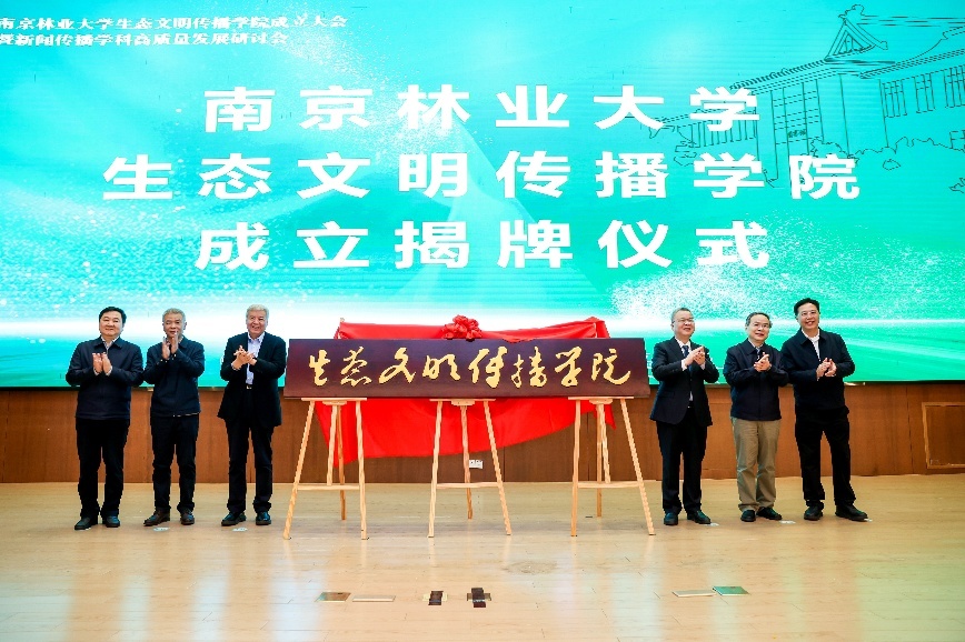 赵树丛、勇强、杨波、葛莱、周跃敏、曾祥谓共同为生态文明传播学院揭牌。会上还举行了捐赠仪式,勇强代表南京林业大学向捐赠单位代表致谢,并为南京宁卫医药集团有限公司、南京状元免教育科技集团有限公司、江苏琦玮建设工程有限公司的代表颁发了捐赠证书。