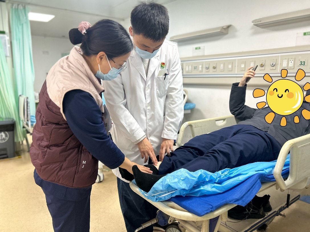 该院急诊医学科护士长毛进、骨科谢文俊主治医师在查看患者受伤部位。