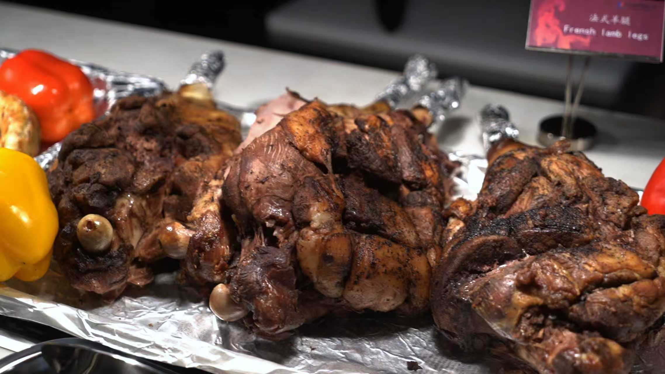 现烤羊腿是热食区的另一个亮点。焦香的外皮包裹着鲜嫩的内里,孜然的香气四溢。这道菜既有西北烧烤的豪迈,又经过精细化的处理,呈现出更加优雅的姿态。