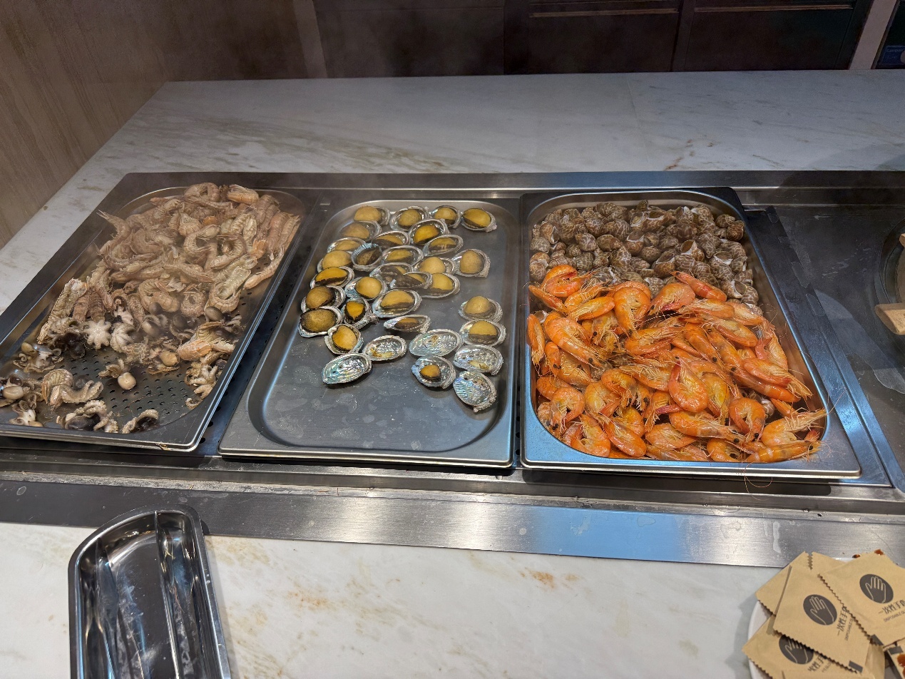 海鲜区的现蒸基围虾和鲍鱼同样令人惊艳。虾身饱满弹牙,鲍鱼肉质紧实,蒜蓉的香气与海鲜的鲜味完美融合。生蚝现开现做,保留了原汁原味的鲜爽,一口下去,仿佛能尝到大海的味道。