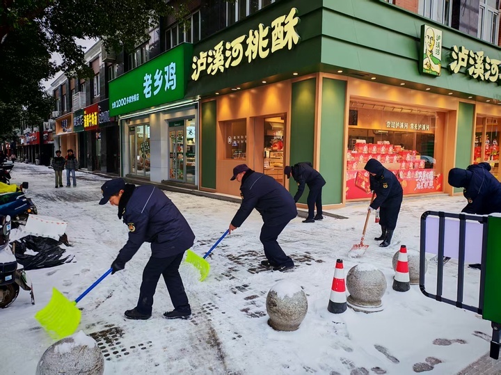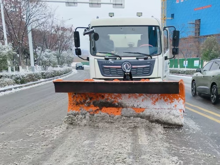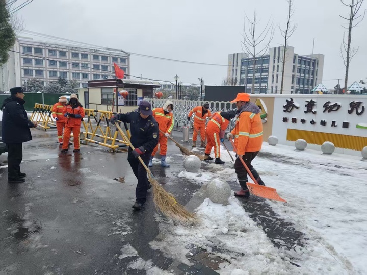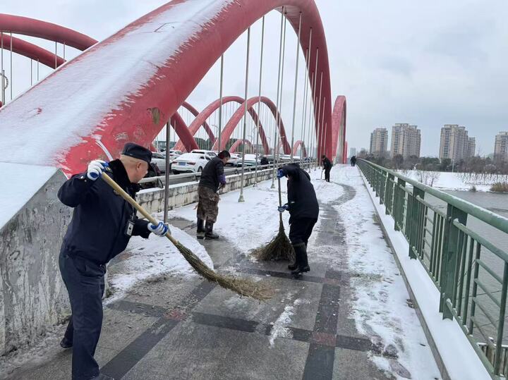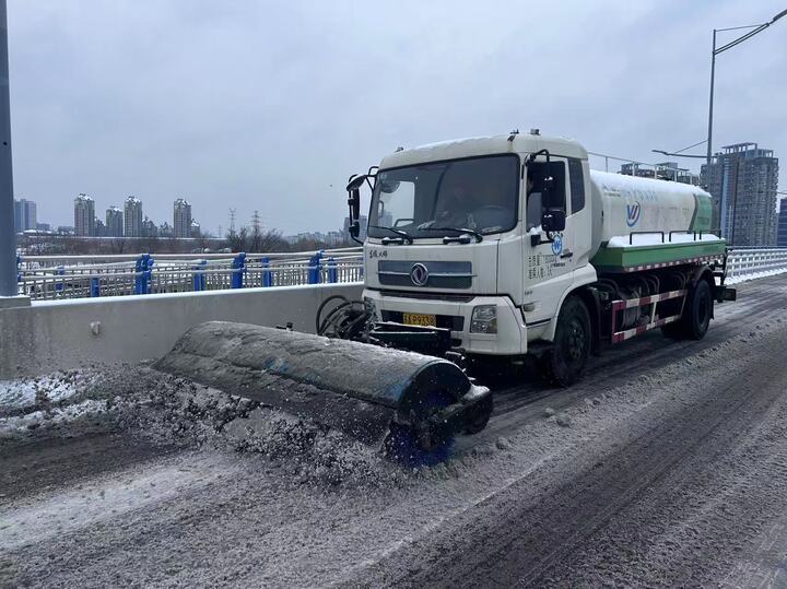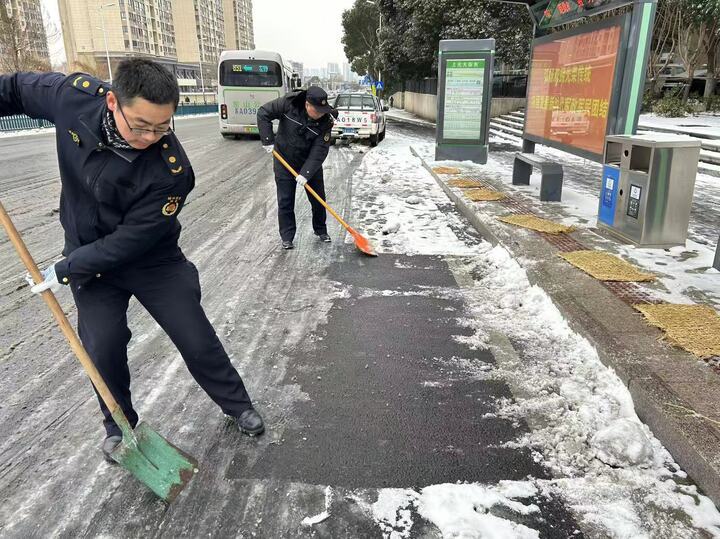 闻雪即动,全力清雪保畅通。降雪之后,全区城管、环卫人员迅速集结,奔赴扫雪一线开展作业。在主次干道、桥梁,扫雪除冰机械车辆实行24小时轮班作业,实现“人歇机不停”,防止路面、桥面结冰上冻,确保市民出行交通畅通;在人行道、过街天桥等机械车辆不易覆盖区域,作业人员手持单人作业工具细致清扫积雪冰泥;对学校周边、农贸市场门口、公交站台、地铁站口等重点区域,提前铺设防滑草垫,有效防范行人滑倒。同时,利用户外电子大屏、倡议书、组织城管队员深入街头巷尾,督促各单位、商户履行“门前三包”责任,宣传发动群众参与扫雪除冰,形成全民参与的良好氛围。