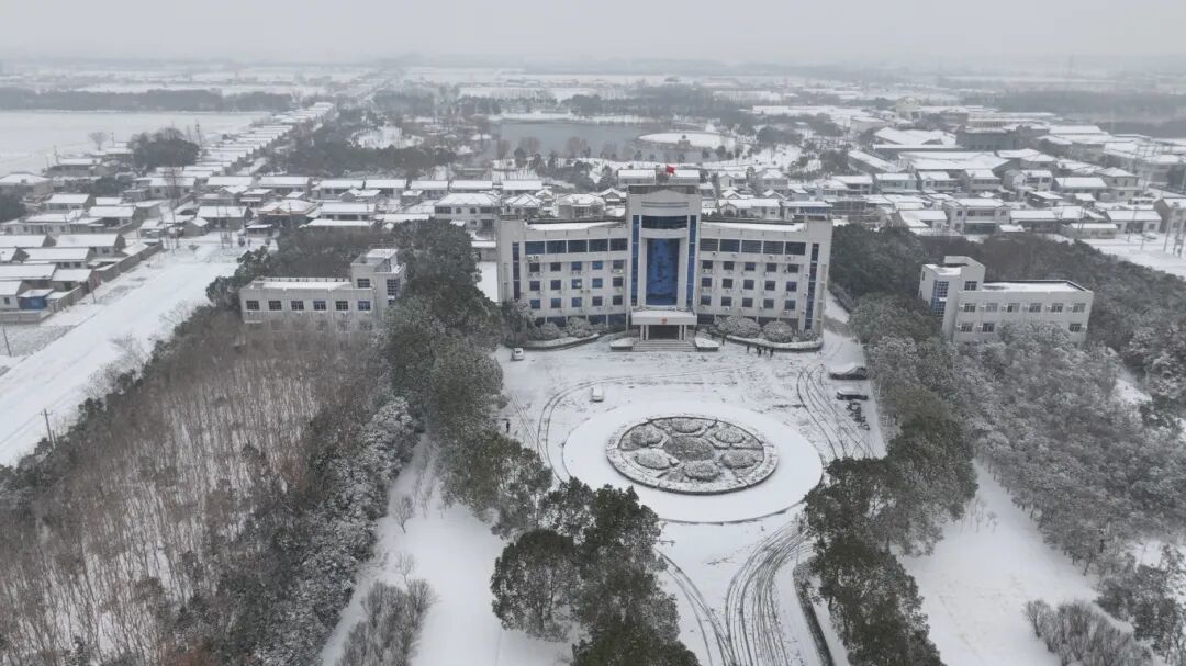 镇政府大楼静立雪中,