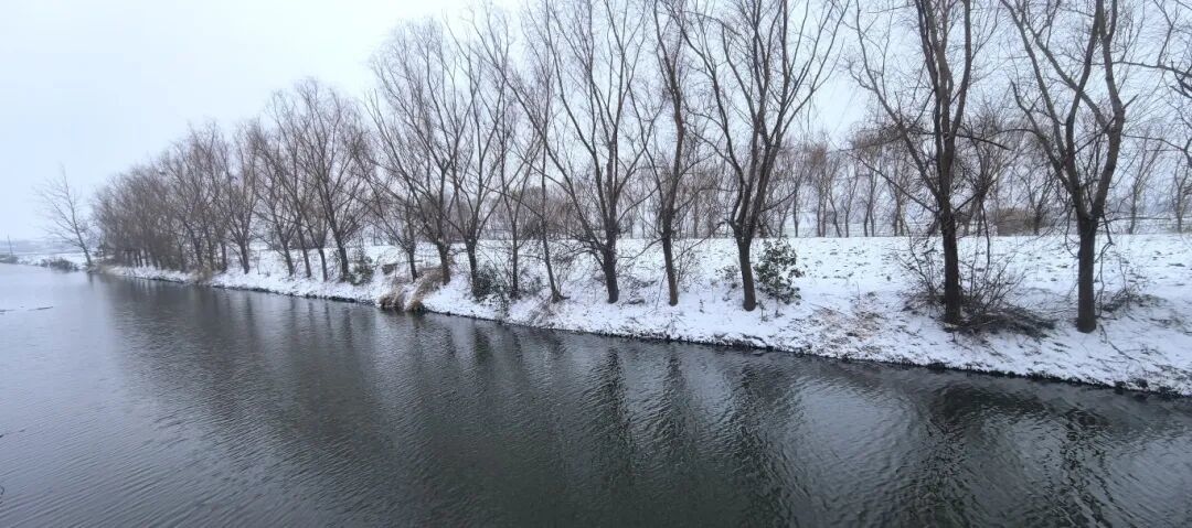 枝桠映着覆雪的岸堤,