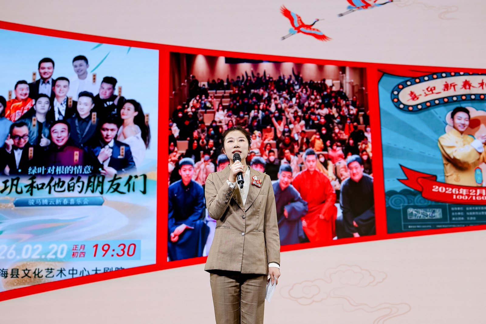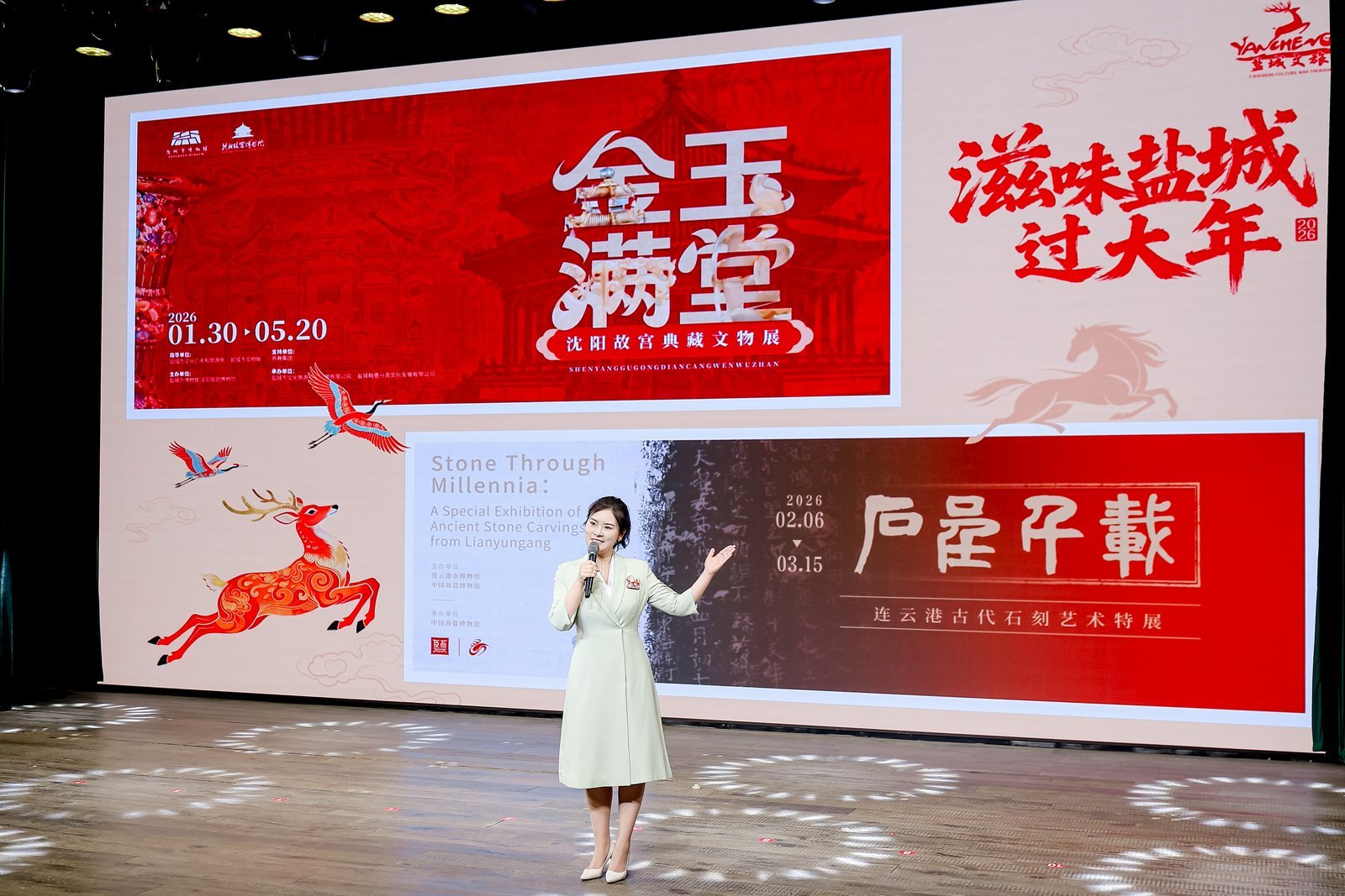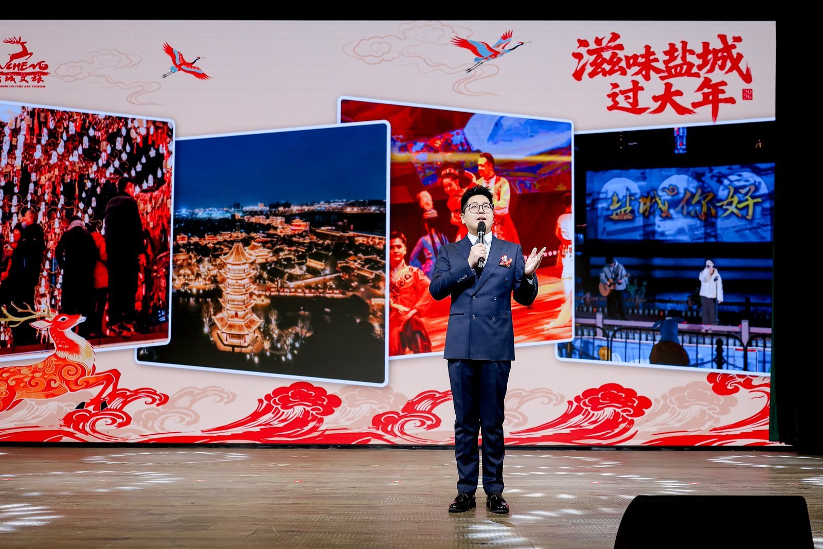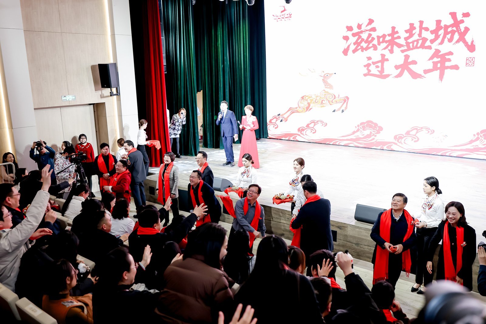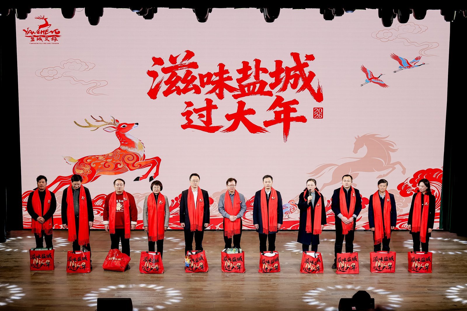“寻味盐城年·文旅局长‘马’上送好礼”环节点燃了全场的热情,11个县(市、区)的文旅局长携带装满家乡心意的“马年福袋”登台,简要介绍各自区域新春特色活动,热情发出邀约,并通过抽奖方式将福袋送给现场幸运观众。福袋内装满各地特色文创与美食,东台发绣、大丰麋鹿公仔、建湖剪纸、盐都马年专属好物等,每一份都承载着盐城各县区的文旅心意与新春祝福。