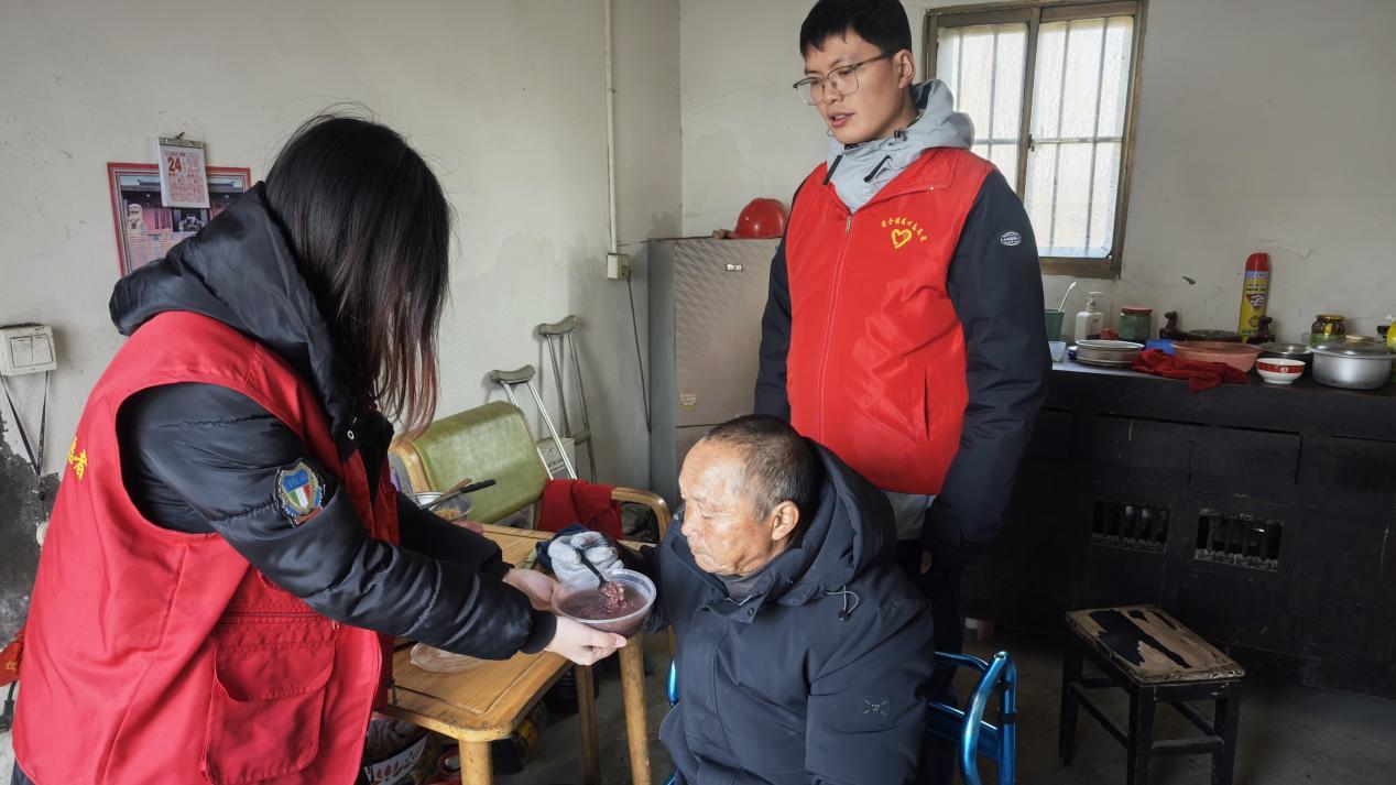 考虑到村里五保户行动不便,无法来到活动现场,志愿者们分装好吃的腊八粥,组成慰问小分队,挨家挨户上门走访慰问。每到一户,志愿者们都将腊八粥亲手送到五保户手中,并与他们亲切交谈,了解他们的生活近况和实际困难。同时,志愿者们还不忘检查屋内的电线线路、取暖设备等,仔细排查冬季防火安全隐患,向老人讲解消防安全知识,提醒他们注意用火、用电、用气安全,切实筑牢冬季安全“防火墙”。