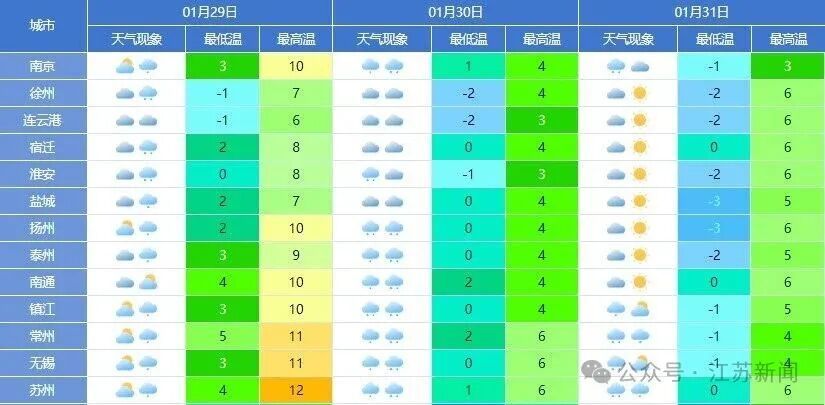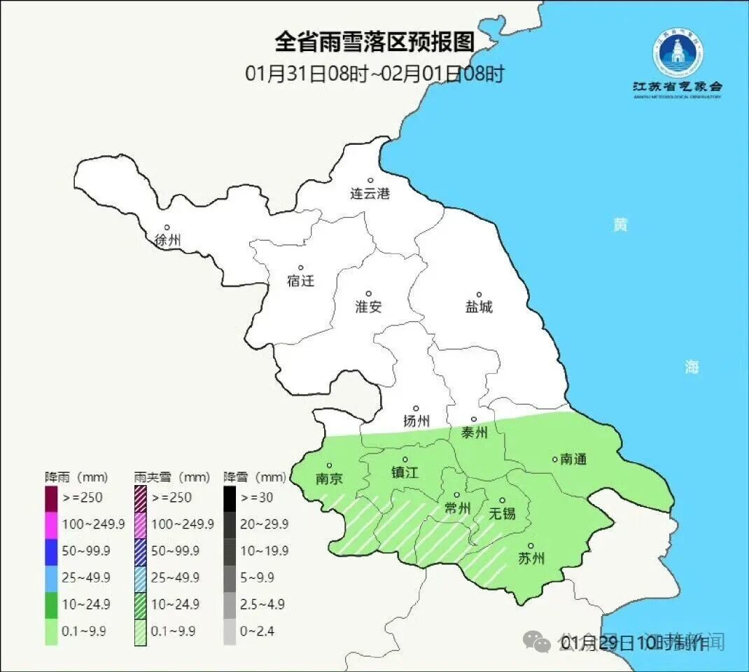 1月29日夜里至31日,江苏大部分地区有一次降水过程,期间雨雪相态复杂。29日夜里至30日白天,全省大部分地区降雨为主,雨量小到中等,徐州、宿迁、淮安有短暂雨夹雪或小雪。