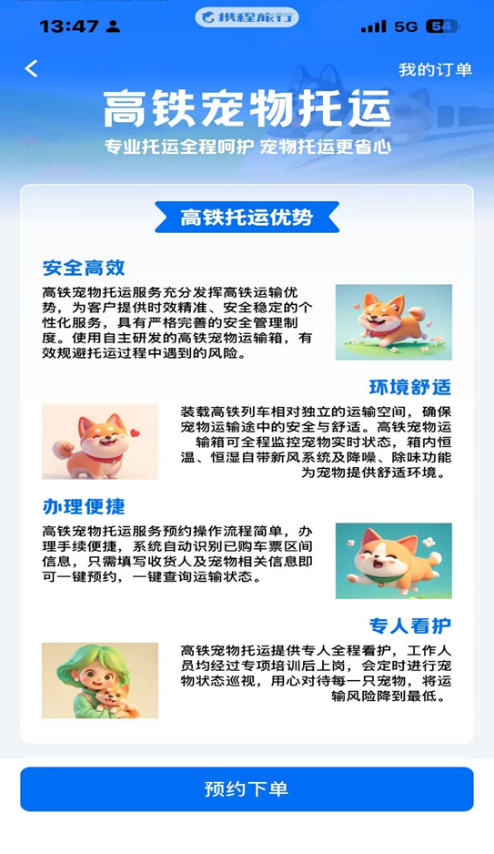 对非购票旅客,可线下办理高铁宠物托运。需在托运日前2至5天,通过“中铁快运”微信小程序,提供宠物相关信息、照片,进行预约下单,最多可托运1只宠物。