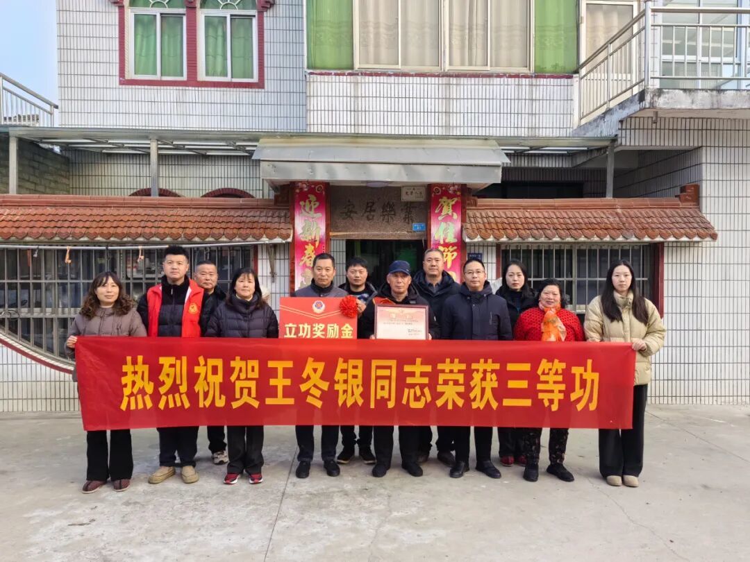 “喜报团”先行来到临塔村的现役军人王冬银家中,现场氛围十分欢乐,伴随着喜庆的锣鼓声,闻讯而来的邻里乡亲纷纷驻足祝贺。杭科长和王主任将三等功喜报、立功奖励金等送至其家人手中,真挚道贺的同时,详细询问了家人的生活近况,并对家属长期以来的默默付出和支持表示感谢。