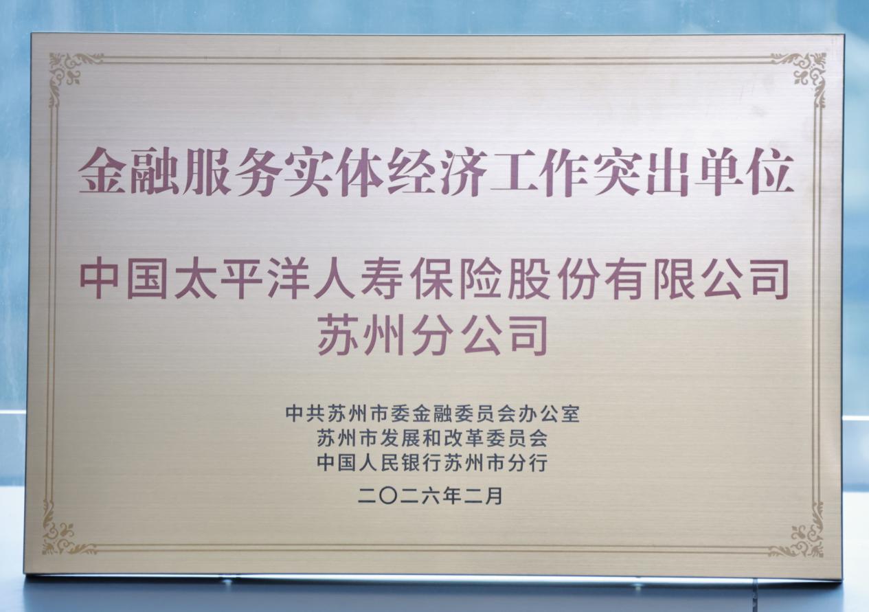 2月2日,在苏州市金融业高质量发展工作推进会上,中国太保寿险苏州分公司凭借在服务苏州实体经济、助力政府完善民生保障以及创新康养产服等领域出色表现,荣获2025年金融服务实体经济工作突出单位,成为全市3家获得此殊荣的寿险公司之一。