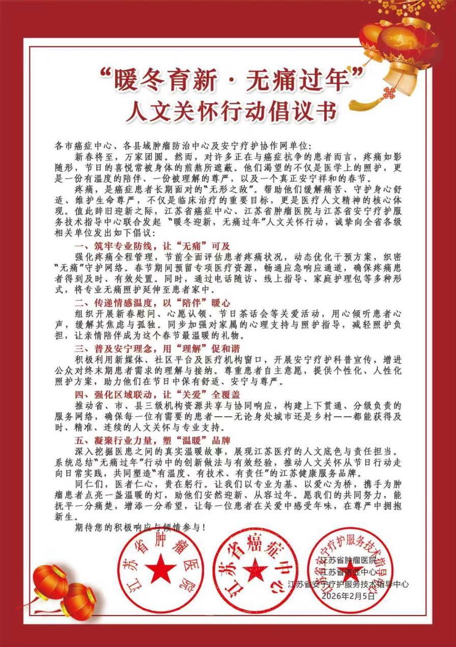 新春将至,岁寒情暖。2026年2月5日,江苏省肿瘤医院(江苏省癌症中心、江苏省安宁疗护服务技术指导中心)与玄武区卫健委联合发起“暖冬育新,无痛过年”人文关怀行动,并发布《“无痛过年”联合行动倡议书》,倡议各界携手帮助癌痛患者度过一个温暖、安宁、有尊严的春节。医院领导、玄武区卫健委领导、安宁疗护协作网成员单位、社区医院代表、医护人员及患者家属共同参与,以专业之力传递温情,共筑暖冬守护。