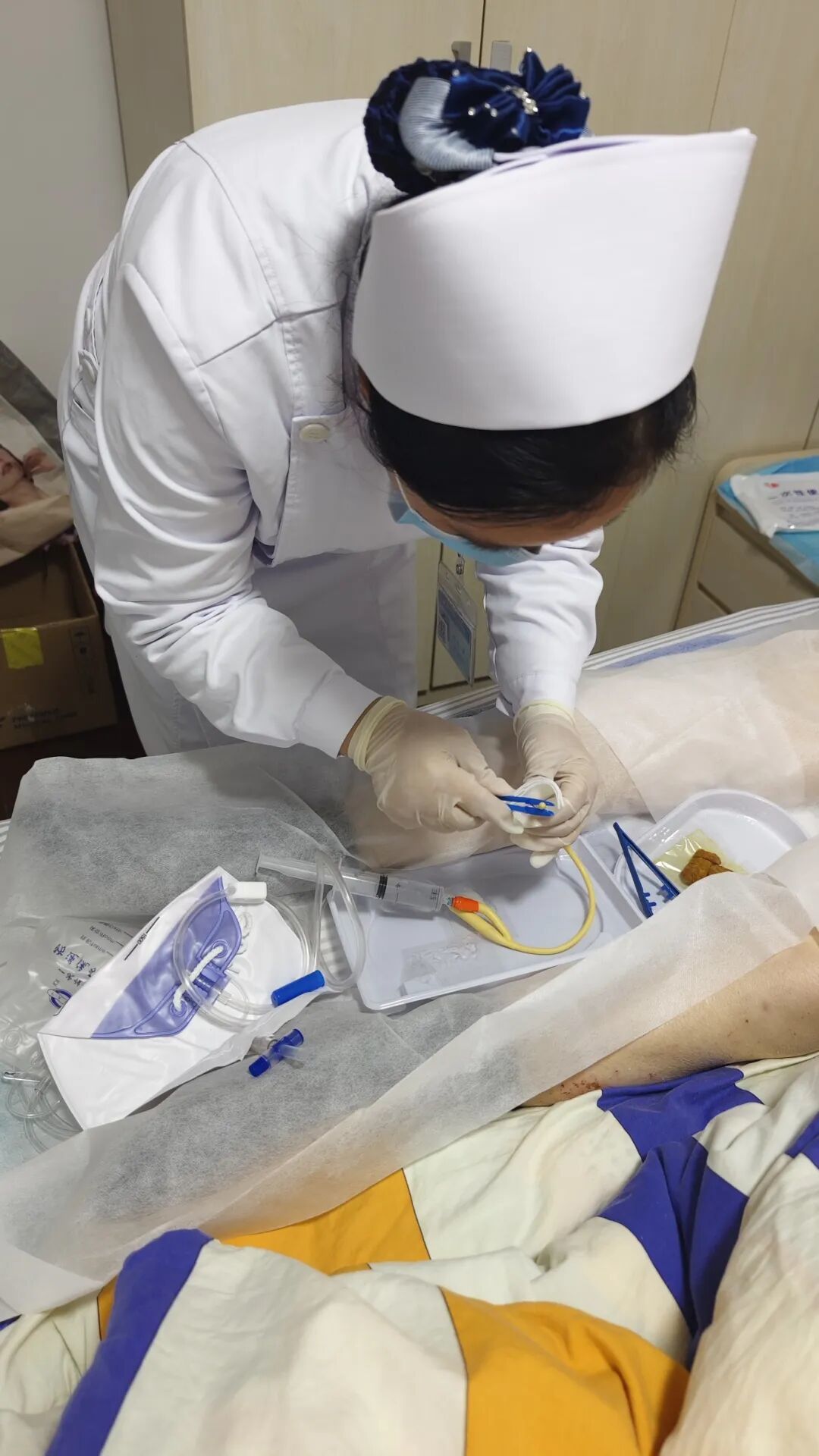 12月8日服务当日,两名医护人员准时抵达。经过细致的健康问询、身体评估和居家环境核查,确认现场操作安全可行。随即,她们严格执行消毒流程,凭借默契的配合与娴熟的技术,顺利完成了导尿管更换操过程,陈奶奶操作中无任何不适。
