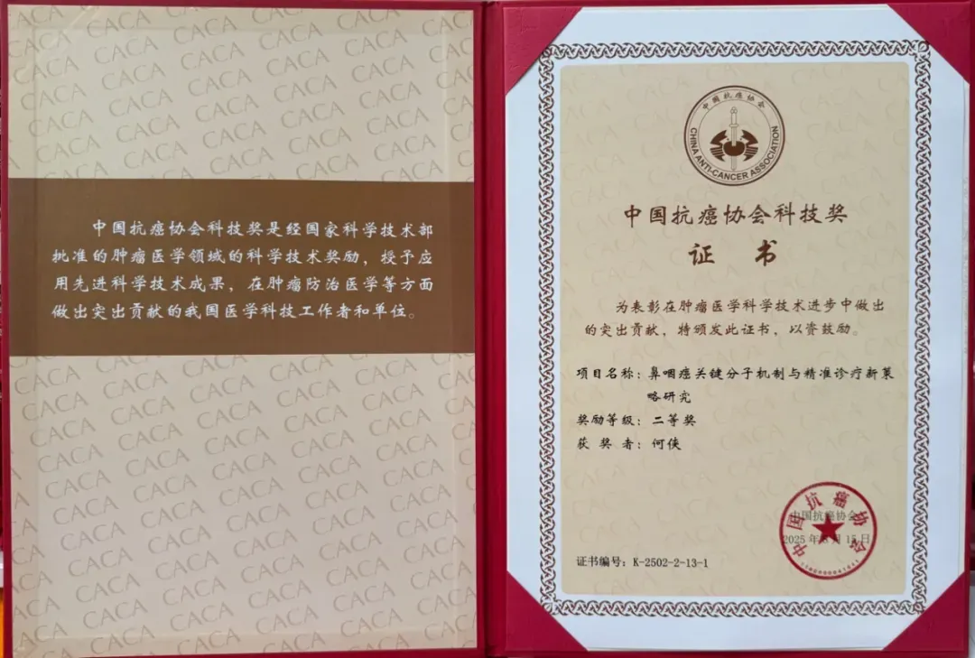 近日举行的中国整合肿瘤学大会(CCHIO)开幕式上,中国抗癌协会科技奖颁奖典礼隆重召开。江苏省肿瘤医院(南京医科大学附属肿瘤医院)党委副书记、副院长何侠教授作为项目负责人,带领团队完成的“鼻咽癌关键分子机制与精准诊疗新策略研究”荣获中国抗癌协会科技奖二等奖。