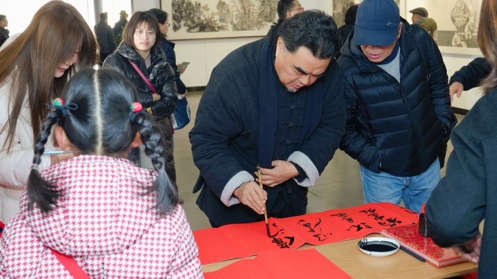 当天还举办了“艺术惠风”第十五届苏报送春联惠民活动,为参展院校、企业、社区等代表赠“福”字,并为2025年敬业奉献类“中国好人”、东渚街道新就业群体党支部书记舒龙赠送了专门创作的中国画作品。艺术家们现场挥毫泼墨,为市民送上新春祝福。红纸铺展、墨香萦绕,传统节庆文化在笔墨间薪火相传。