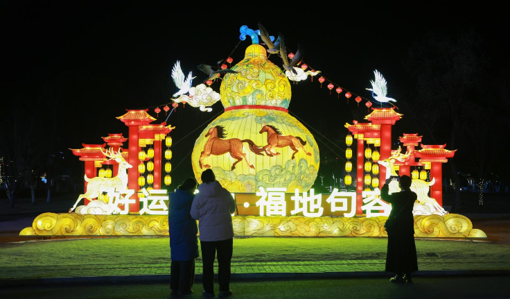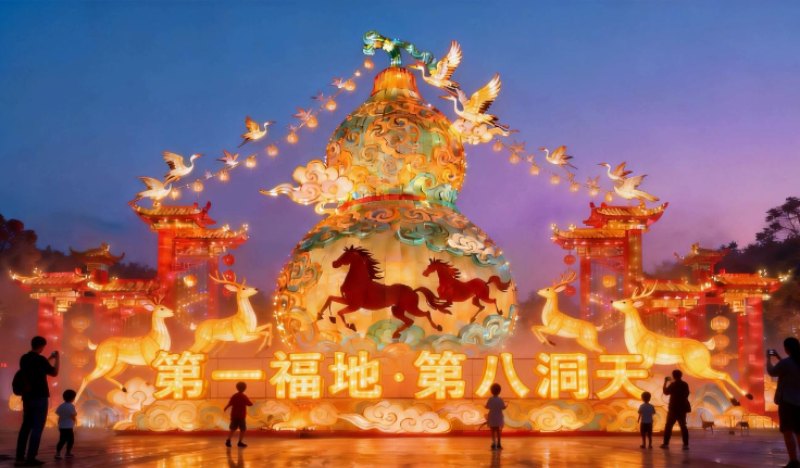 值得关注的是,景区首次引入新春游园灯会。灯会布置了“福满人间”“仙鹿驼福”“龙马巡天”等十余组大型灯组,将传统工艺与现代光影结合,打造出璀璨梦幻的夜间景观。灯会期间,游客可漫步山间,赏灯观景,感受沉浸式氛围。
