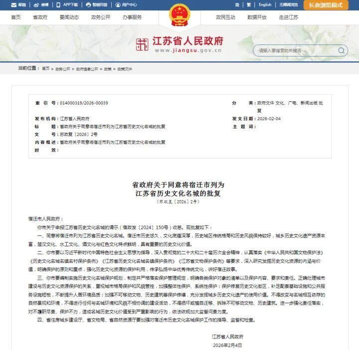 日前,省政府已正式批复同意宿迁为江苏省历史文化名城。至此,拥有超2700多年建城史的宿迁,成为全省历史文化名城版图中的一员。