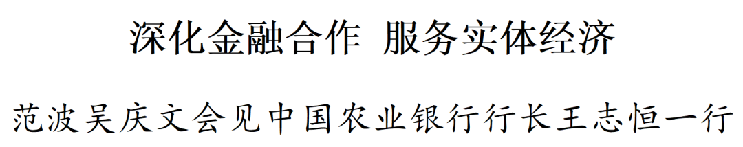 2月11日,市委书记范波、市长吴庆文会见了中国农业银行党委副书记、行长王志恒一行。