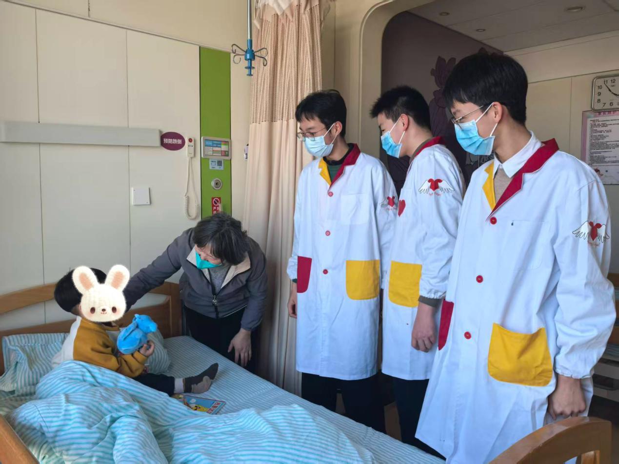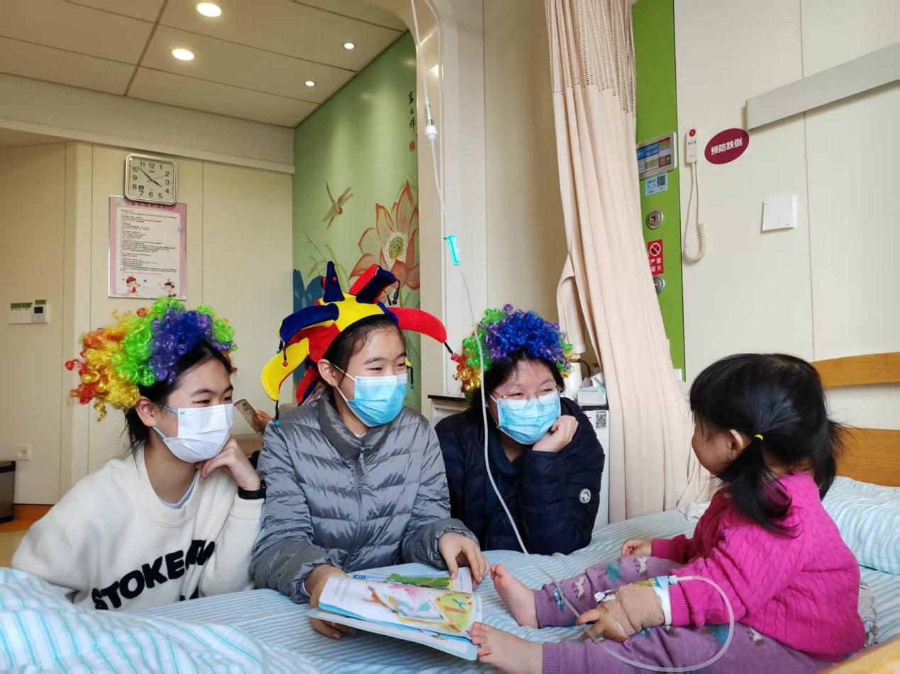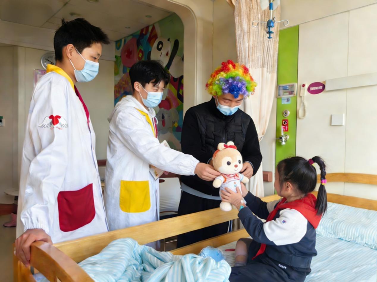 活动现场,一群身着彩色小丑服、面带微笑的初、高中学生志愿者在医务社工给的带领下进入病房间,。他们手持中国结、冰箱贴和手绘贺卡,用稚嫩却真挚的声音为小患者们送上新春祝福。有的志愿者坐在床边陪小患者读绘本、玩益智游戏,有的则带领大家折纸、猜灯谜,病房里不时传来阵阵笑声,一扫往日的沉闷与紧张。