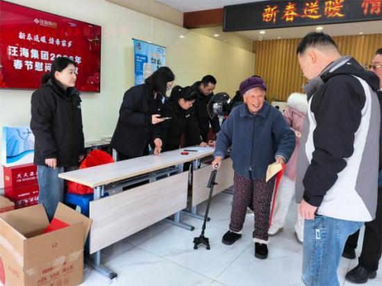 活动现场气氛热烈又温馨,老人们早早来到社区活动中心,有序排队等候,脸上满是期待的笑容。当汪海集团工作人员将慰问金逐一送到老人们手中时,老人们纷纷激动地握住工作人员的手,眼中闪烁着感激的泪花。一位90多岁的老奶奶紧紧拉着工作人员的手,声音颤抖地说:“这么多年一直记挂着我们这些老骨头,每年都给我们送钱,让我们心里暖乎乎的。”工作人员还与老人们亲切交谈,仔细询问大家的身体状况和生活情况,反复叮嘱老人们保重身体、安享晚年,暖心的互动让现场暖意融融。