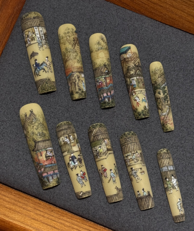 东海穿戴甲的走红,离不开传统美学与现代工艺的融合。在当地穿戴甲设计与制造中心,记者看到,甲片制作需经过设计图稿、手绘或打印、镶嵌东海水晶、封层等多道工序,“福”字、骏马贺岁等春节主题甲片笔触精细,每一颗东海水晶的镶嵌都凸显东方美学韵味。“这些甲片不只是装饰,更是握在指尖的‘文化密码’。”探访记者表示,传统纹样与现代设计的碰撞,让小小的甲片承载了浓厚的中国年味。