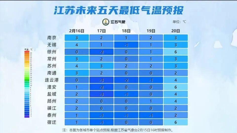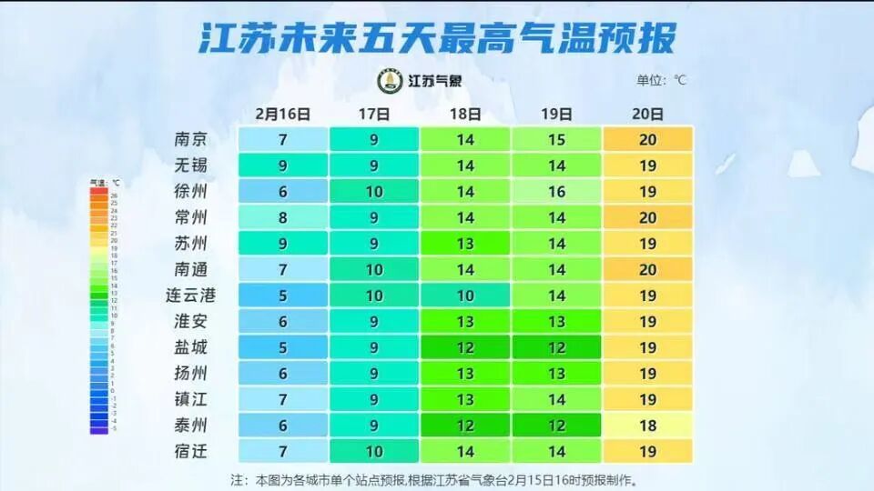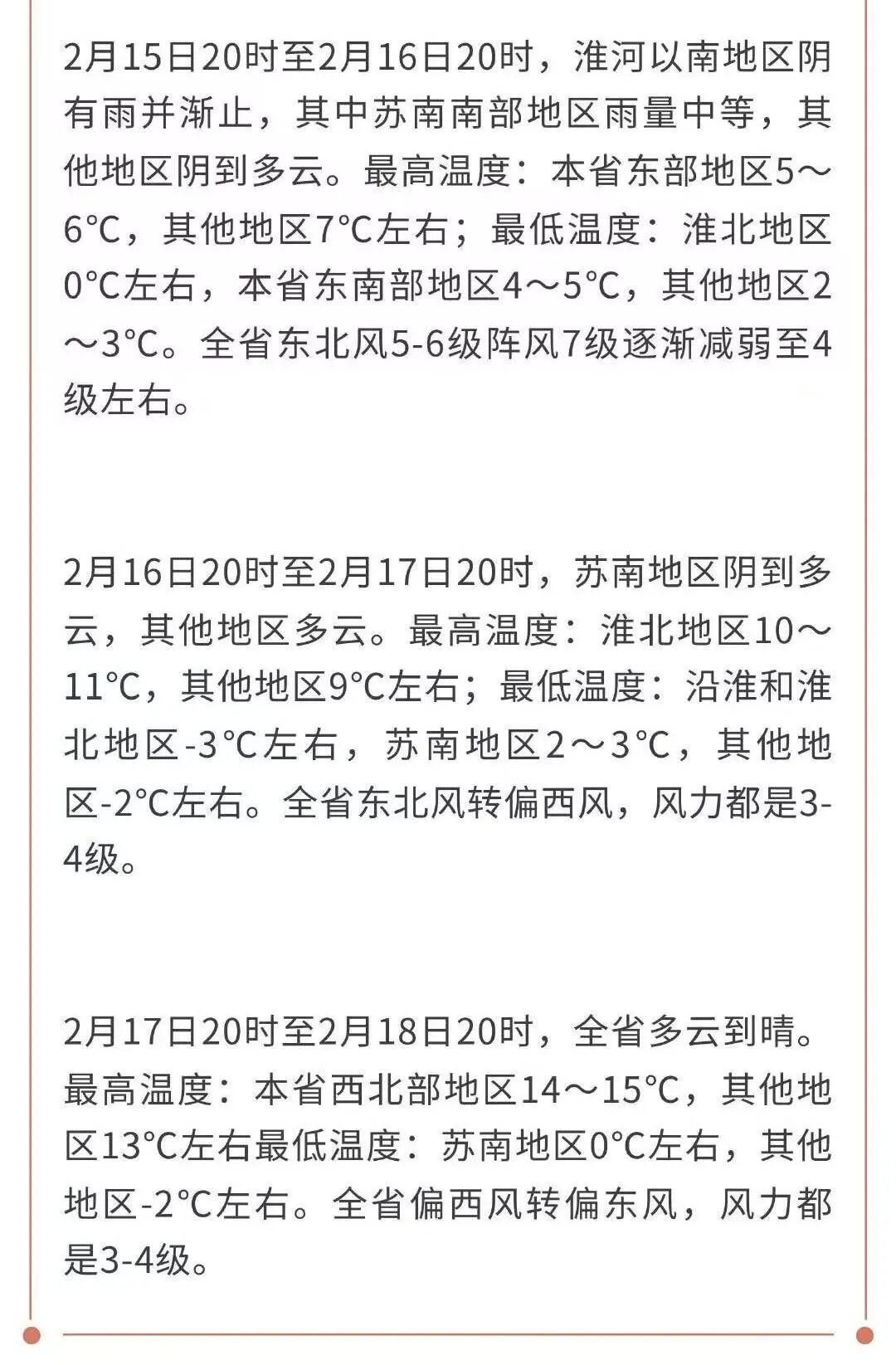 从2月15日起,有一次较强冷空气东移南下,江苏全省48小时最低气温降幅在6~8℃。今天白天苏南地区有小雨天气并渐止,其他时段全省以多云天气为主。