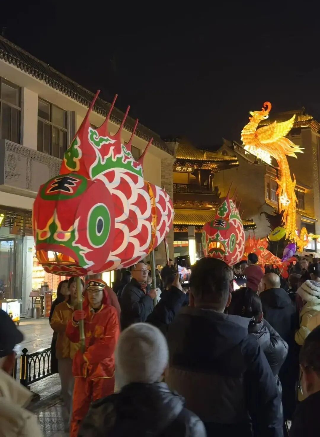 身着红衣的鱼灯手高举灯盏,引领“大鱼”在人潮中灵动穿梭。斑斓灯影游走巷陌,金凤彩灯凌空展翅,灯火映古建,人潮漾欢喜,尽显徐州独有的新春雅韵。