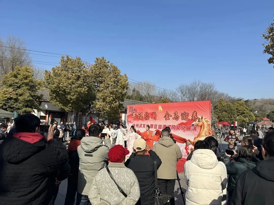 汉文化景区内,“午福临门・金马迎春”国潮汉风展演重磅启幕,楚王授封大典实景重现,甲胄朝代秀、解忧公主盘鼓舞等节目轮番上演,景区全天保持高位客流。