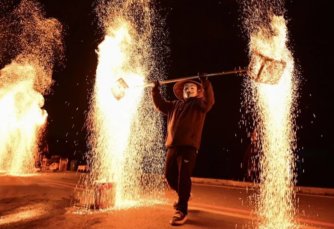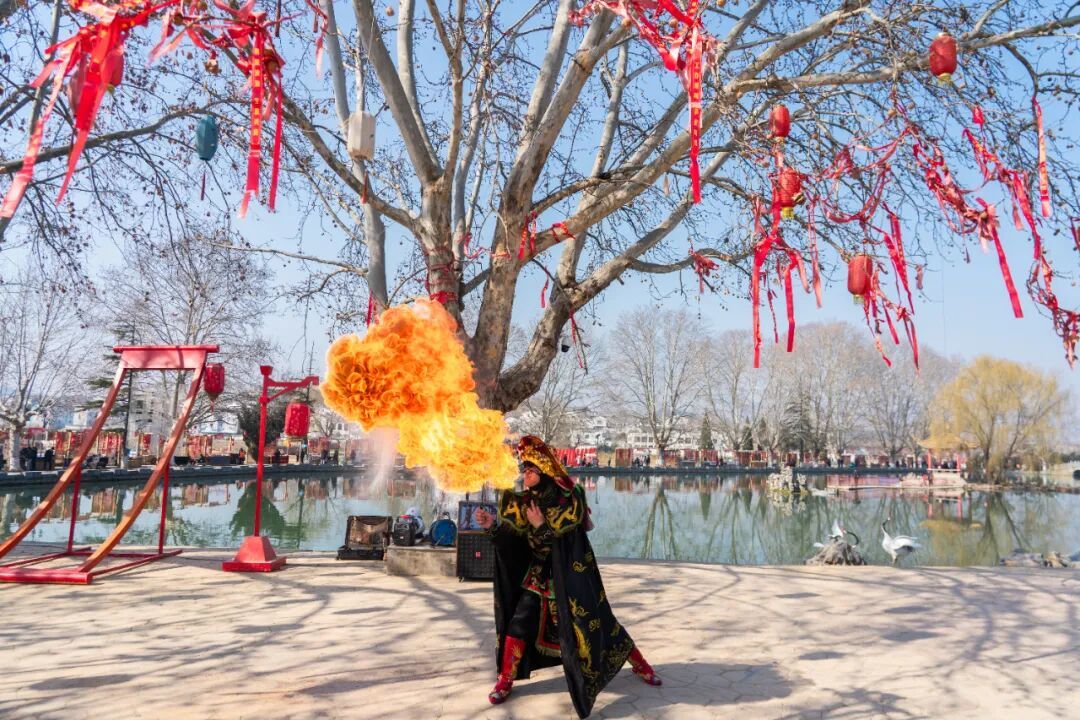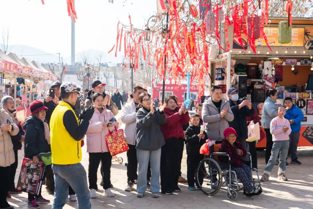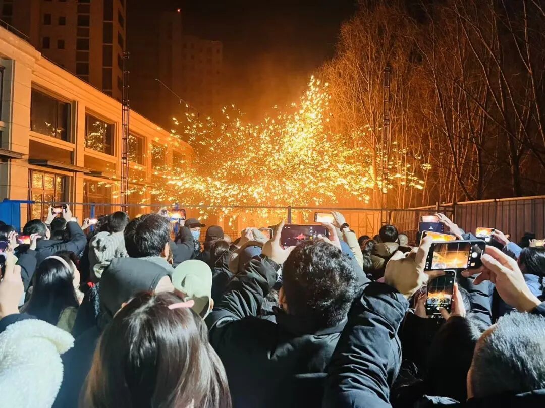 从早玩到晚,精彩非遗展演不断。“迎新春烙烙馍比赛”火热开赛,各村高手同台竞技,动作娴熟,香气四溢。赛场旁的新市集里,年货展、民俗坊、美食荟人潮涌动,热闹非凡。待到夜幕降临,非遗打铁花与冰雪世界梦幻同框,铁花飞溅如流星,与冰雪交相辉映,冰火交织,美得出圈,现场人山人海,赞叹不绝。