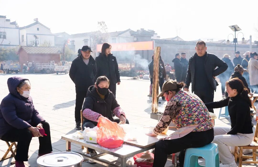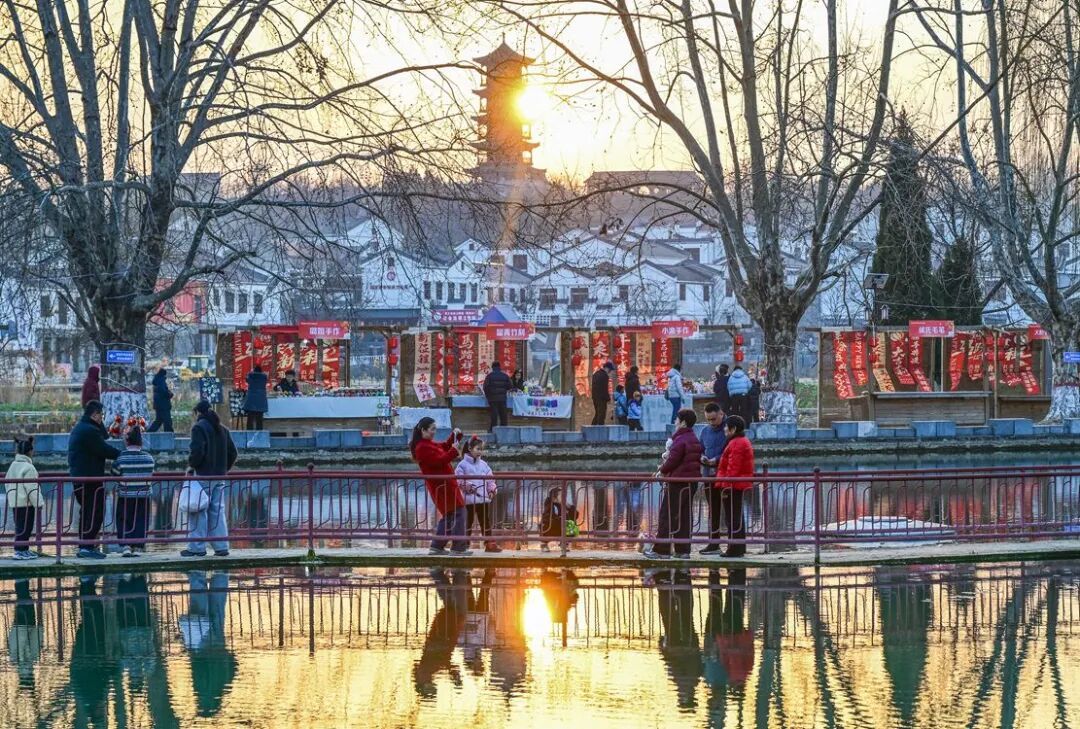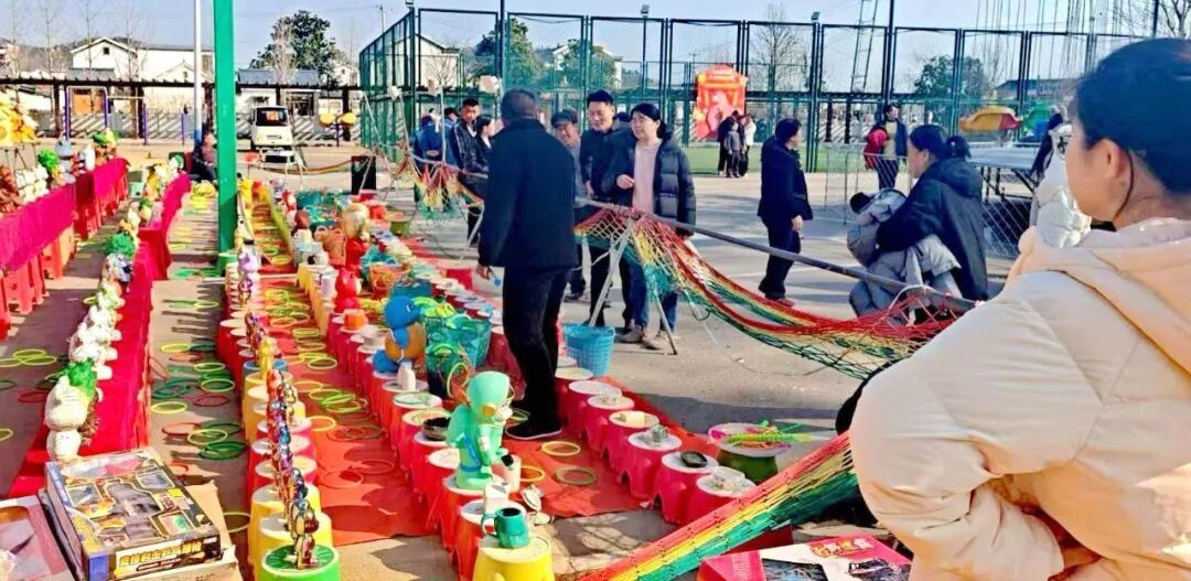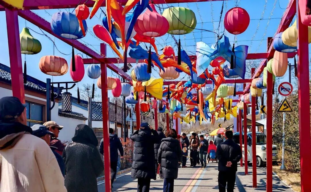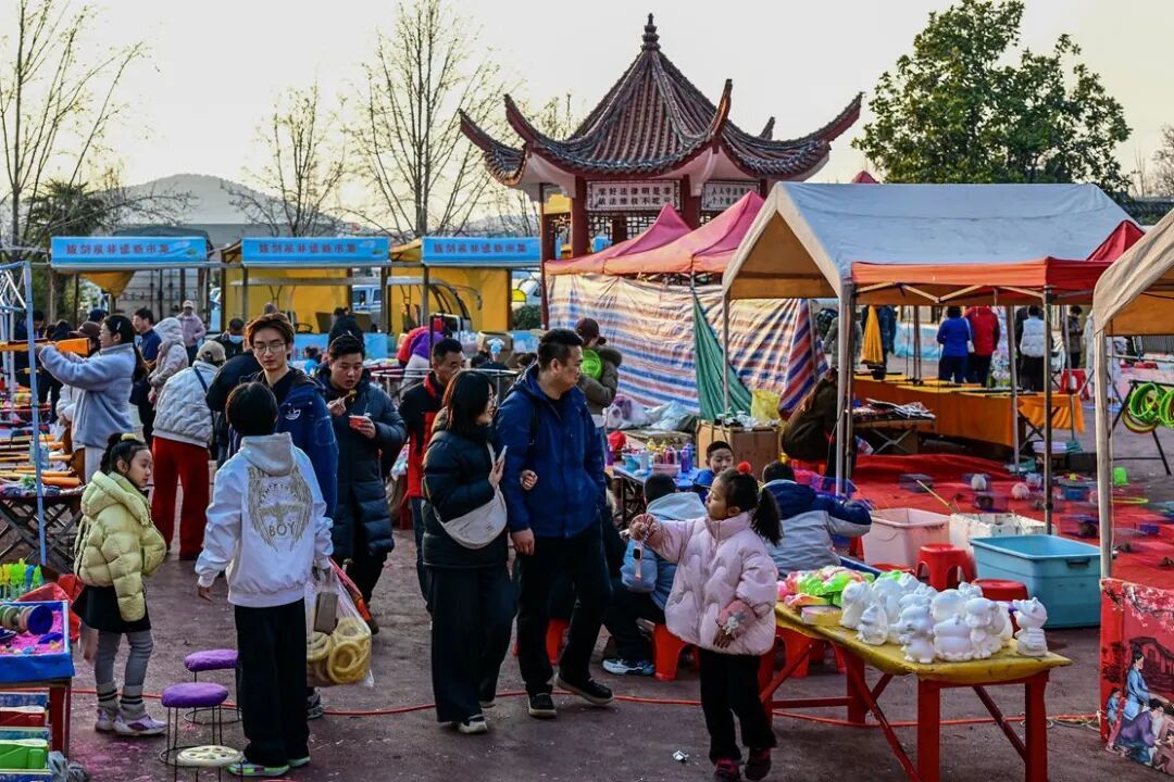 梁堂古村“花巷市集”热闹开市。百余摊位沿巷铺展,土鸡蛋、腊肉等农产品备受青睐;剪纸、糖画等非遗技艺现场展示;冰糖葫芦、烤红薯香气四溢。亲子游园套圈、猜灯谜欢笑声不绝,古村内人流如织,年味浓郁。