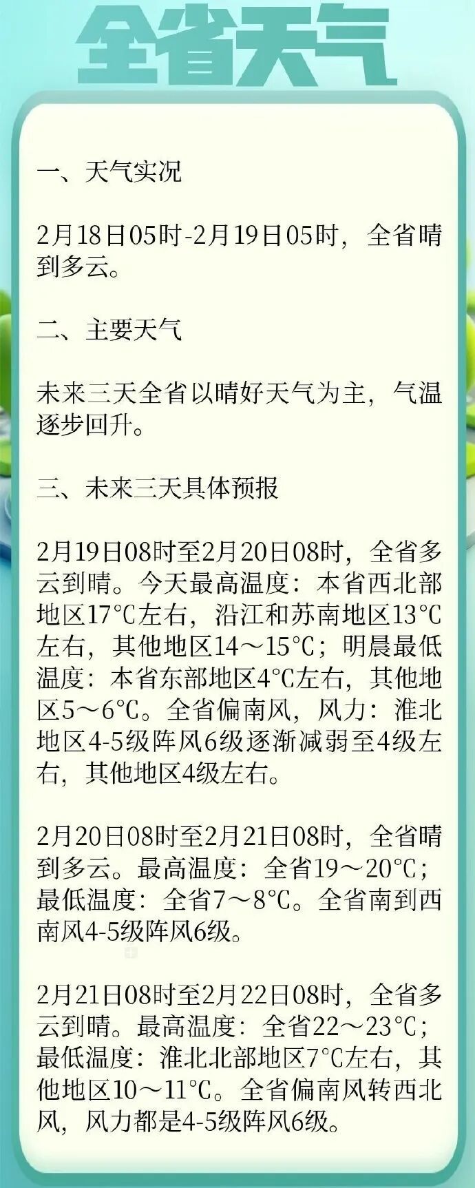 2月19日08时至2月20日08时,全省多云到晴。今天最高温度:本省西北部地区17℃左右,沿江和苏南地区13℃左右,其他地区14~15℃;明晨最低温度:本省东部地区4℃左右,其他地区5~6℃。全省偏南风,风力:淮北地区4-5级阵风6级逐渐减弱至4级左右,其他地区4级左右。