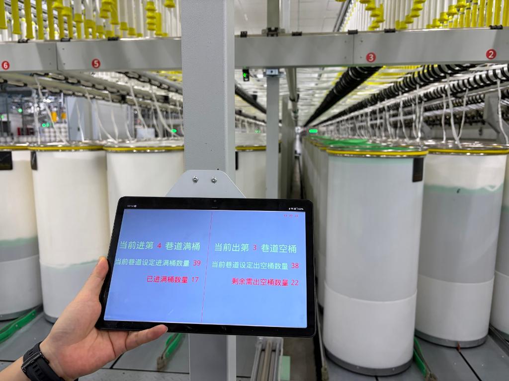 工人展示智慧纺纱工厂生产线上的智能控制设备。新华社记者柯高阳 摄