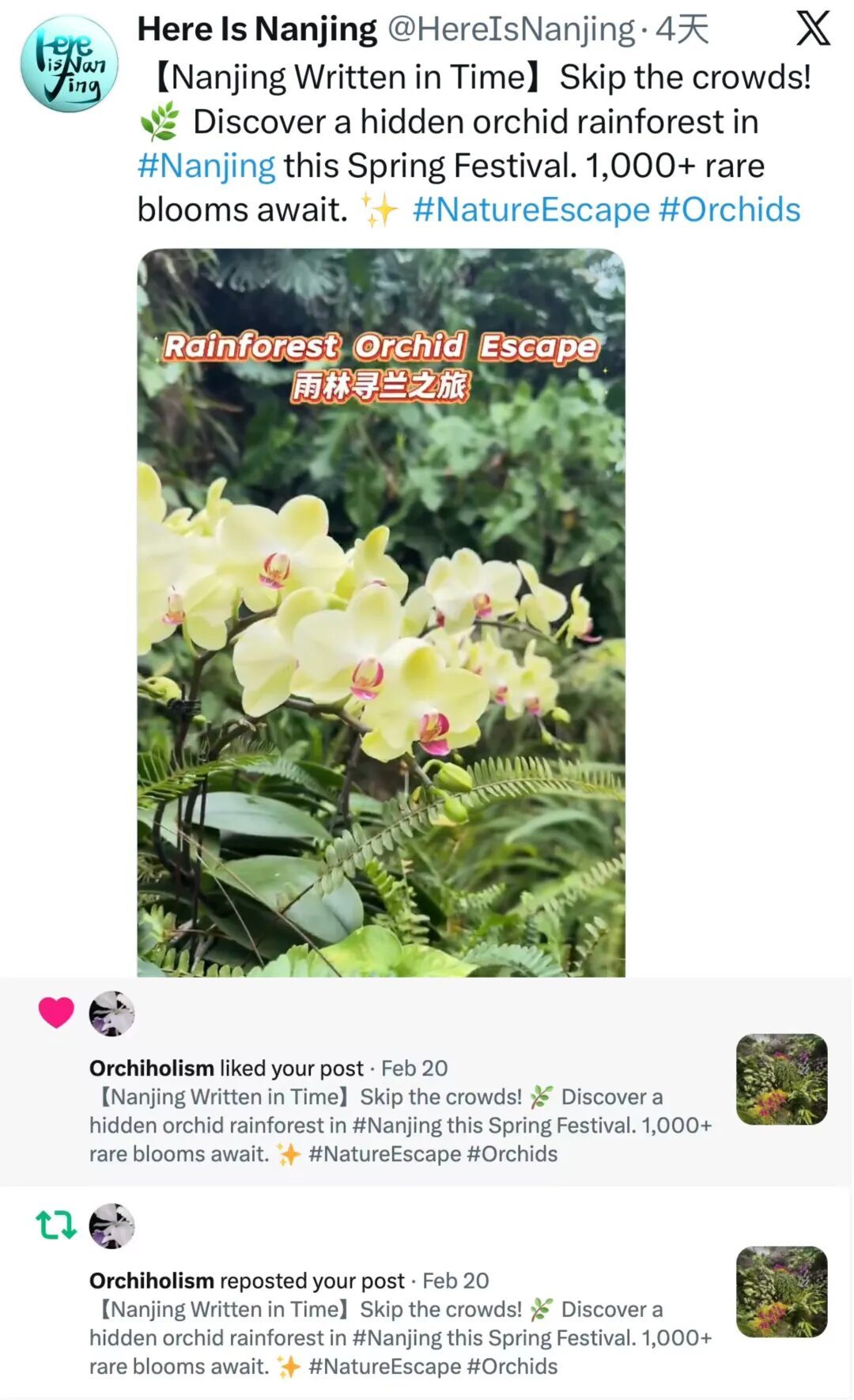 Here Is Nanjing通过一批图文和短视频,向网友介绍春节假期南京的好去处。其跟进中山植物园第六届兰花展,发布《雨林秘境:南京发现1000种稀有兰花》视频,被美国兰花协会(American Orchid Society)的成员点赞。