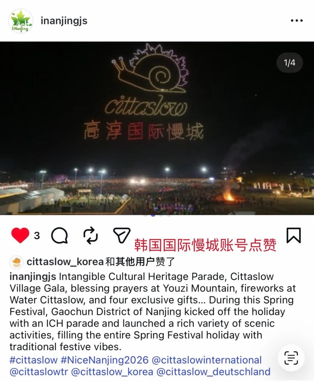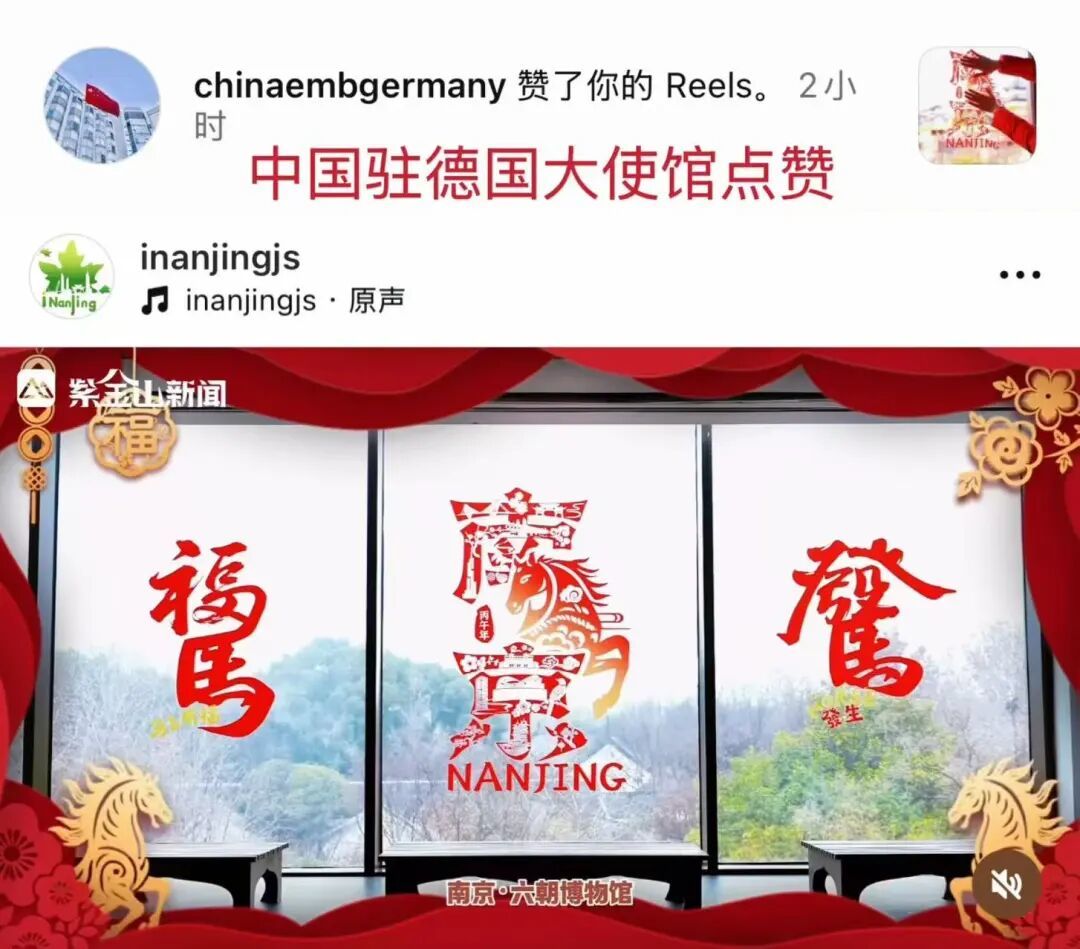 春节期间,iNanjing发布《南京夫子庙千年文脉邂逅潮流街舞》视频,鲜活展现潮流文化与南京传统地标的碰撞,获中国驻法国大使馆点赞,视频中的两位外国舞者也参与评论,成为中外文化交流的亮眼瞬间。iNanjing发布的系列春节民俗内容,如《来南京,全城偶遇“福”窗》视频,获中国驻德国大使馆点赞;通过图文介绍高淳国际慢城非遗活动,获得韩国国际慢城账号关注并点赞。