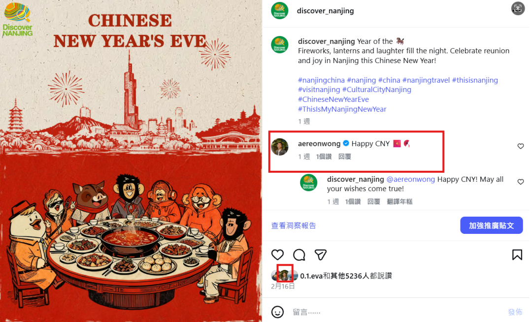 Discover Nanjing春节期间发布“外宾礼遇——国际象棋主题系列海报”,聚焦入境游客与海外侨胞,介绍牛首山、汤山等区域新春活动及游览体验,并邀请网友参与“寻马计划”。此外,账号还结合紫峰大厦、玄武湖等南京地标,联动烫头鸭、银背大猩猩等创意动物IP发布除夕创意海报,获得西雅图摄影师塔里卡·阿卜杜勒·莫内姆、马来西亚网红旅游博主点赞并留言互动。