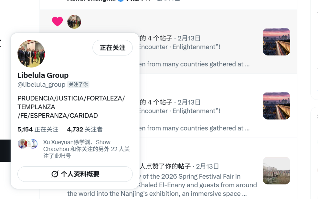 Discover Nanjing紧扣南京新春线下活动,全方位展现南京春节的时尚活力与城市魅力,获联合国新闻秘书埃尔娜拉·巴伊纳扎罗娃点赞,秘鲁移动可持续发展咨询机构点赞、转发。账号同时聚焦南京特色文化体验,分享江宁织造博物馆的“大梦·红楼”沉浸式演出,获得西班牙演讲者、选美比赛教练亚历山大点赞并转发;账号还发布了南京饮马巷年俗视频,还原老城新春烟火气息,获巴利阿里群岛高级音乐学院教授点赞。