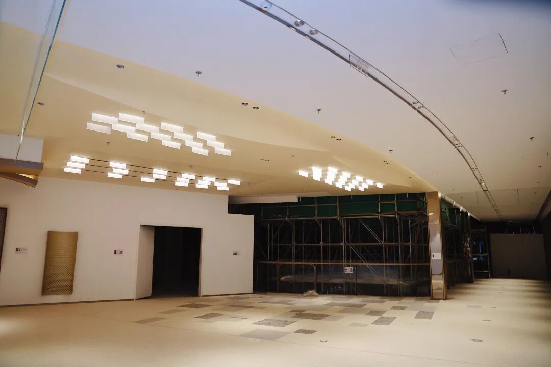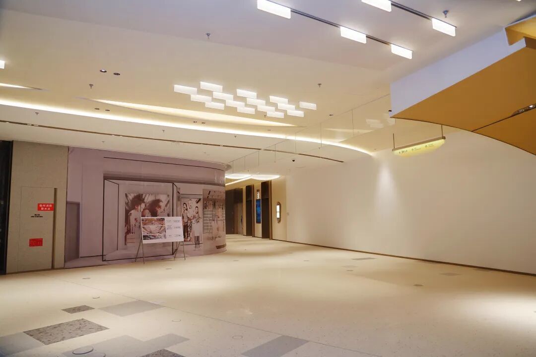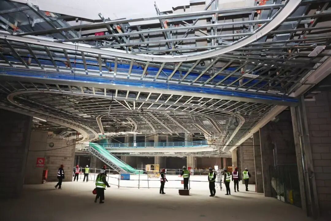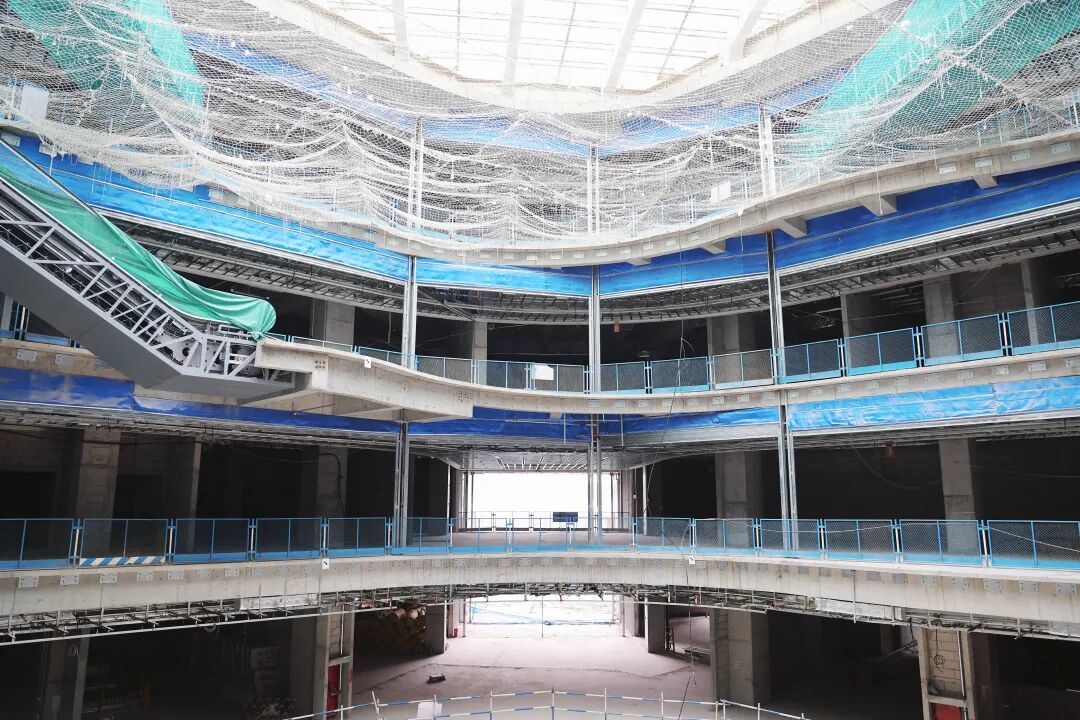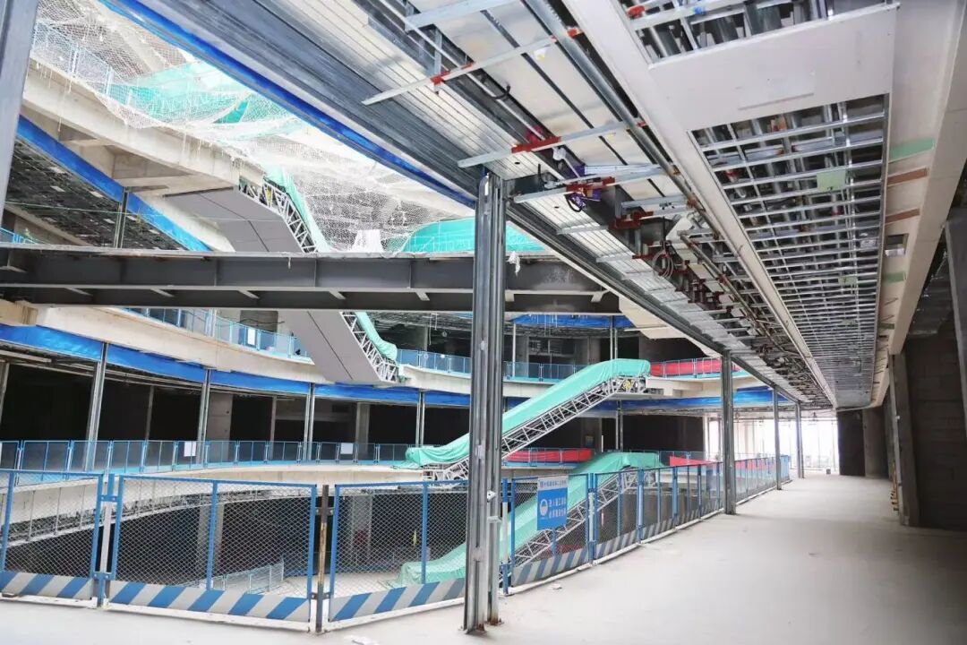 深入工地内部,除了精装修尚未完成,映入眼帘的已然是大型购物中心场景,采光顶、公共区域、28部商场内扶梯、集成吊顶等内部主要设施已基本竣工。
