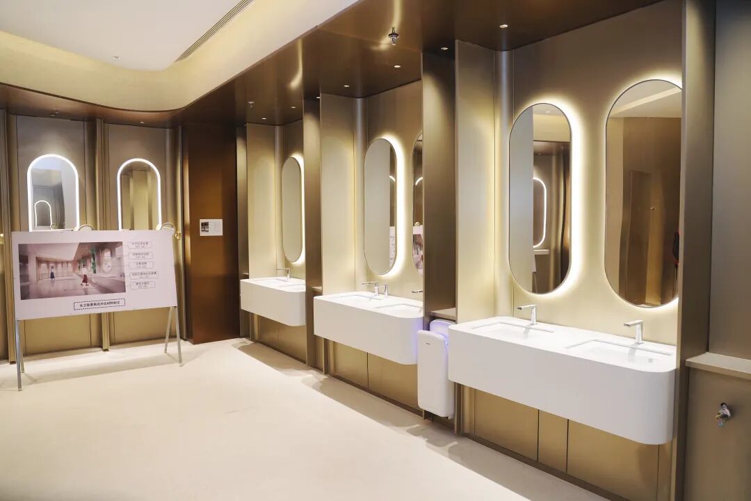 令人惊喜的是,商场的公共卫生间设计美观实用,女厕空间和坑位多于男厕,动线布局、洗手池、化妆镜等细节设计也十分讨喜。
