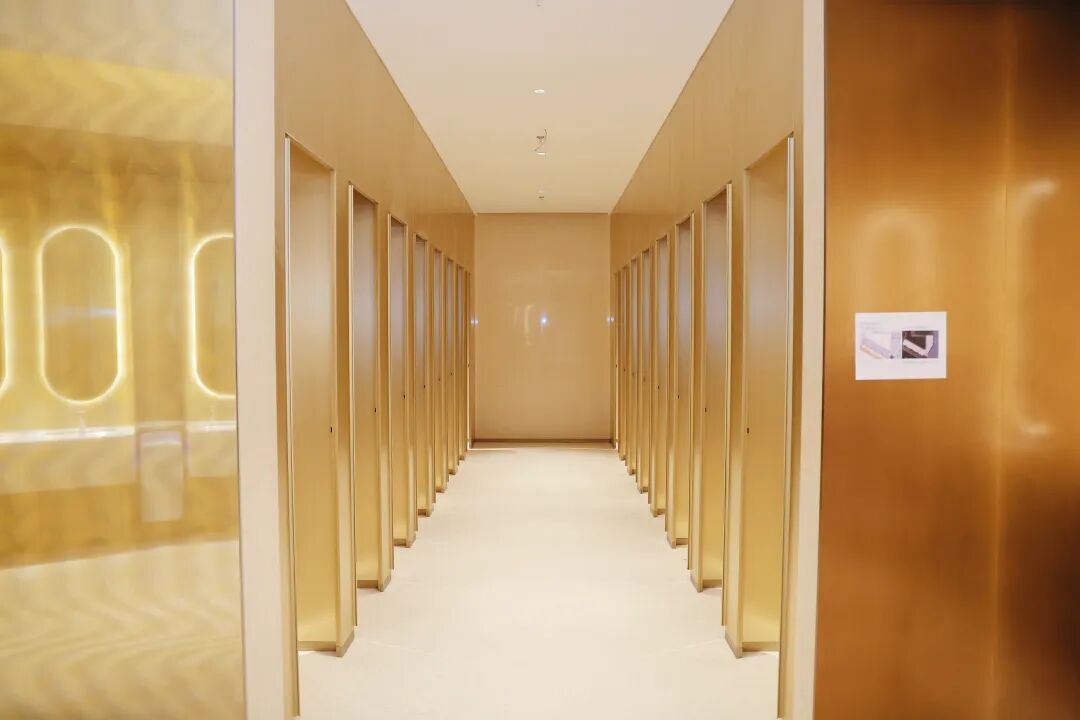 全部采用雾面大理石上墙,顶部流线造型的灯光搭配精心设计的吊顶,空间通透感拉满。