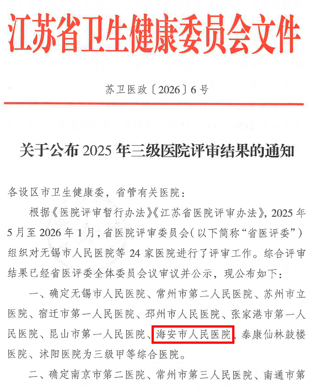 核定海安市人民医院为