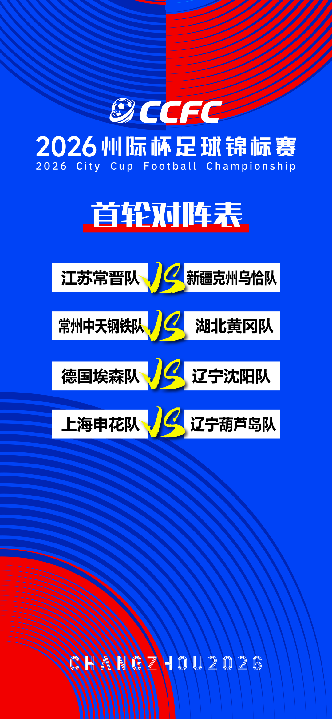 本次参赛球队阵容颇具看点,既有江苏常晋队、常州中天钢铁队两支本土力量,也有来自中国顶级职业联赛的上海申花队;既有辽宁沈阳队、辽宁葫芦岛队等东北足球中坚,也有湖北黄冈队、新疆克州乌恰队等具有深厚文化底蕴的队伍;更有一支来自常州国际友好城市——德国埃森队的加入。