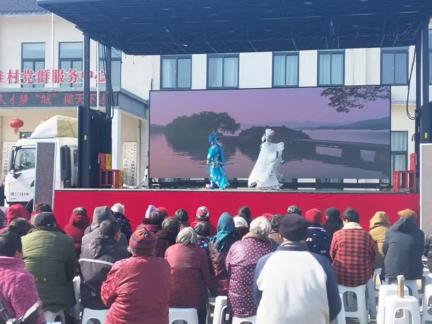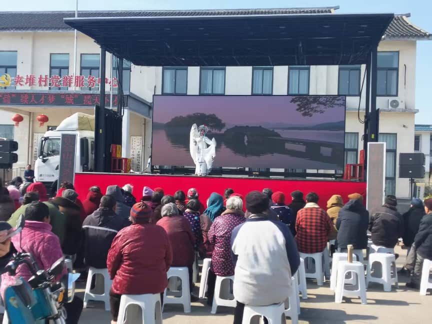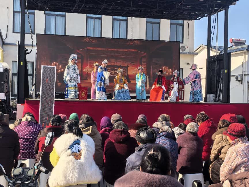 当日下午,夹堆村新时代文明实践站的舞台早已布置就绪。锣鼓声未响,现场已座无虚席,村民们早早赶来,老戏迷们围坐前排翘首以盼,孩子们在家长身旁好奇张望,共同赴这场春日文化之约。随着悠扬的胡琴声划破晴空,演出正式拉开帷幕。《白蛇传・断桥》的恩怨缠绵、《玉杯缘・花园会》的才子佳人、《秦香莲・三年来》的悲欢离合、《牙痕记・金殿认子》的家国情怀,一个个淮剧经典选段轮番上演。演员们身着绣工精美的戏服,以字正腔圆的唱腔、细腻传神的身段,将剧中人物的喜怒哀乐刻画得入木三分,婉转的曲调在村头巷尾萦绕,让现场观众沉浸式感受传统戏曲的独特魅力。