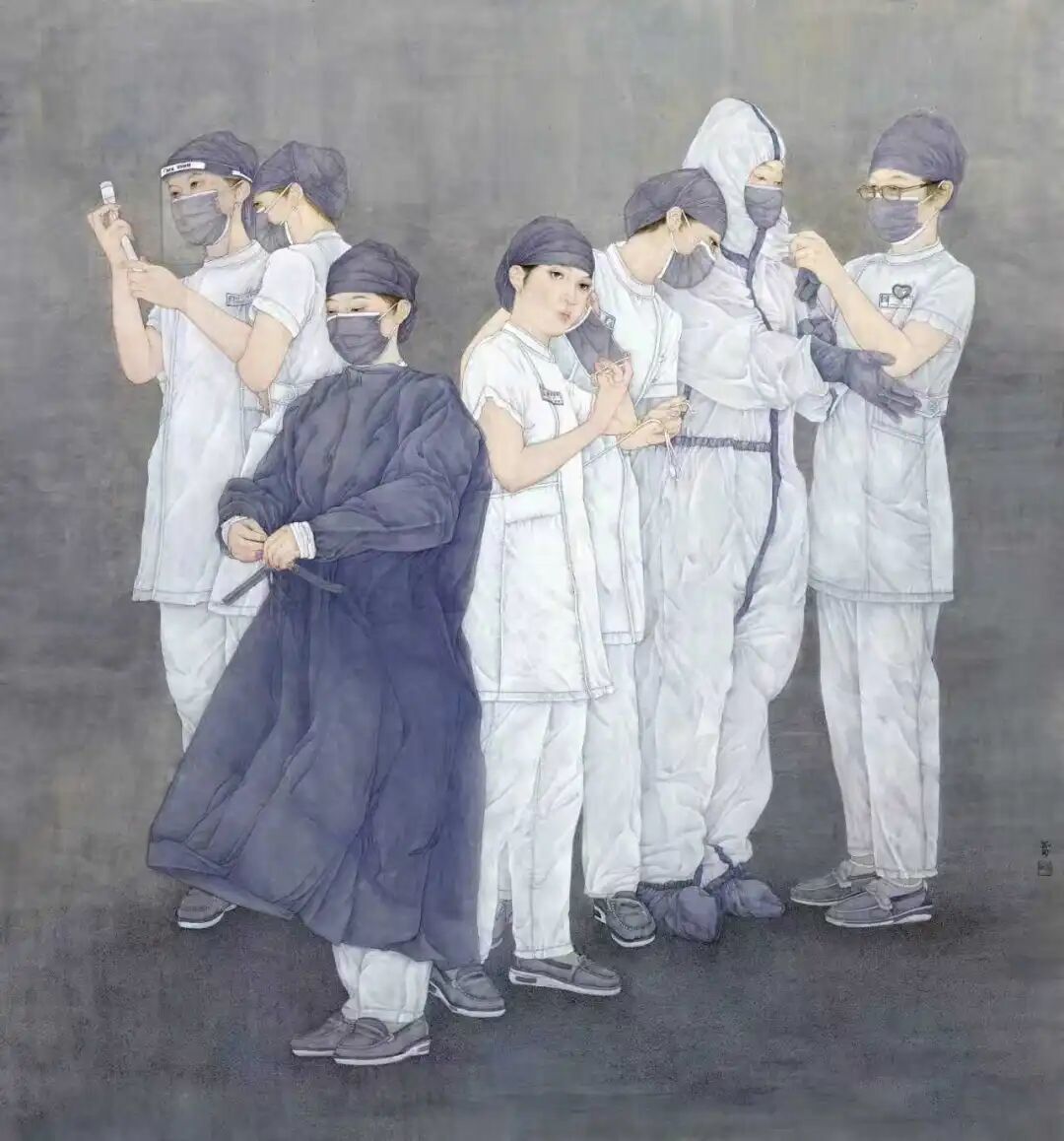 樊蕾参展作品为荣获“百年华彩—2021中国百家金陵画展”(典藏作品)的《同心》。作品以细腻工笔刻画中国女医护人员同心协力、共抗疫情的动人场景,笔墨精谨、气韵生动,既彰显中国女性的坚韧与大爱,也以艺术语言记录时代、传递温暖,兼具思想性与艺术感染力。